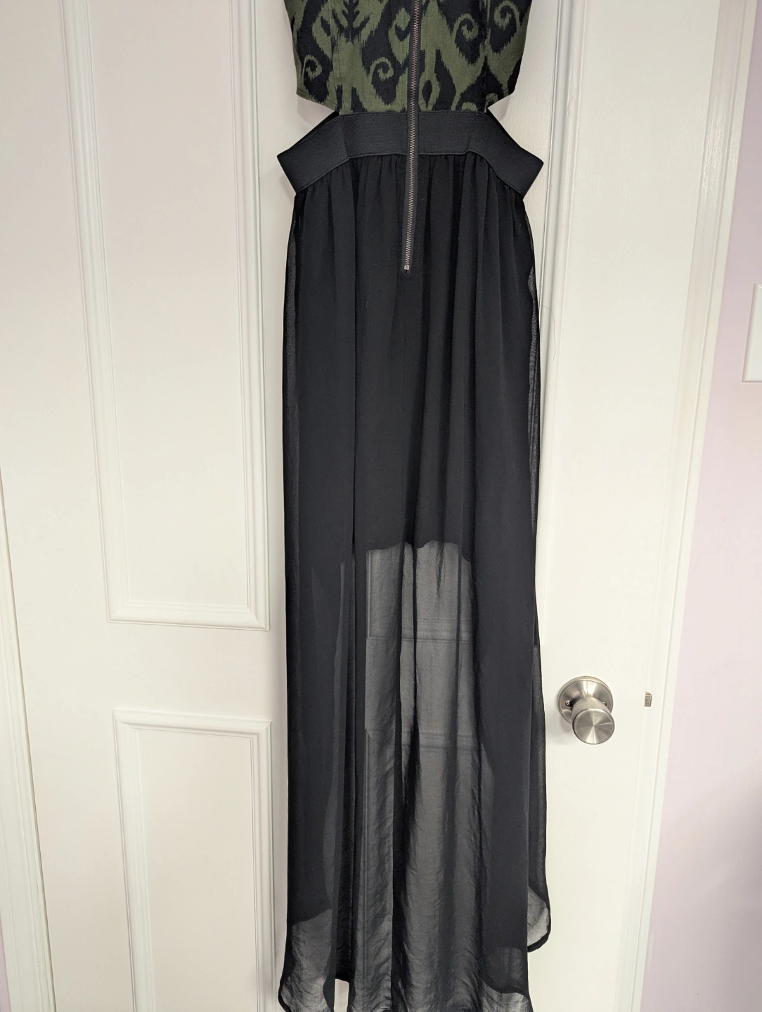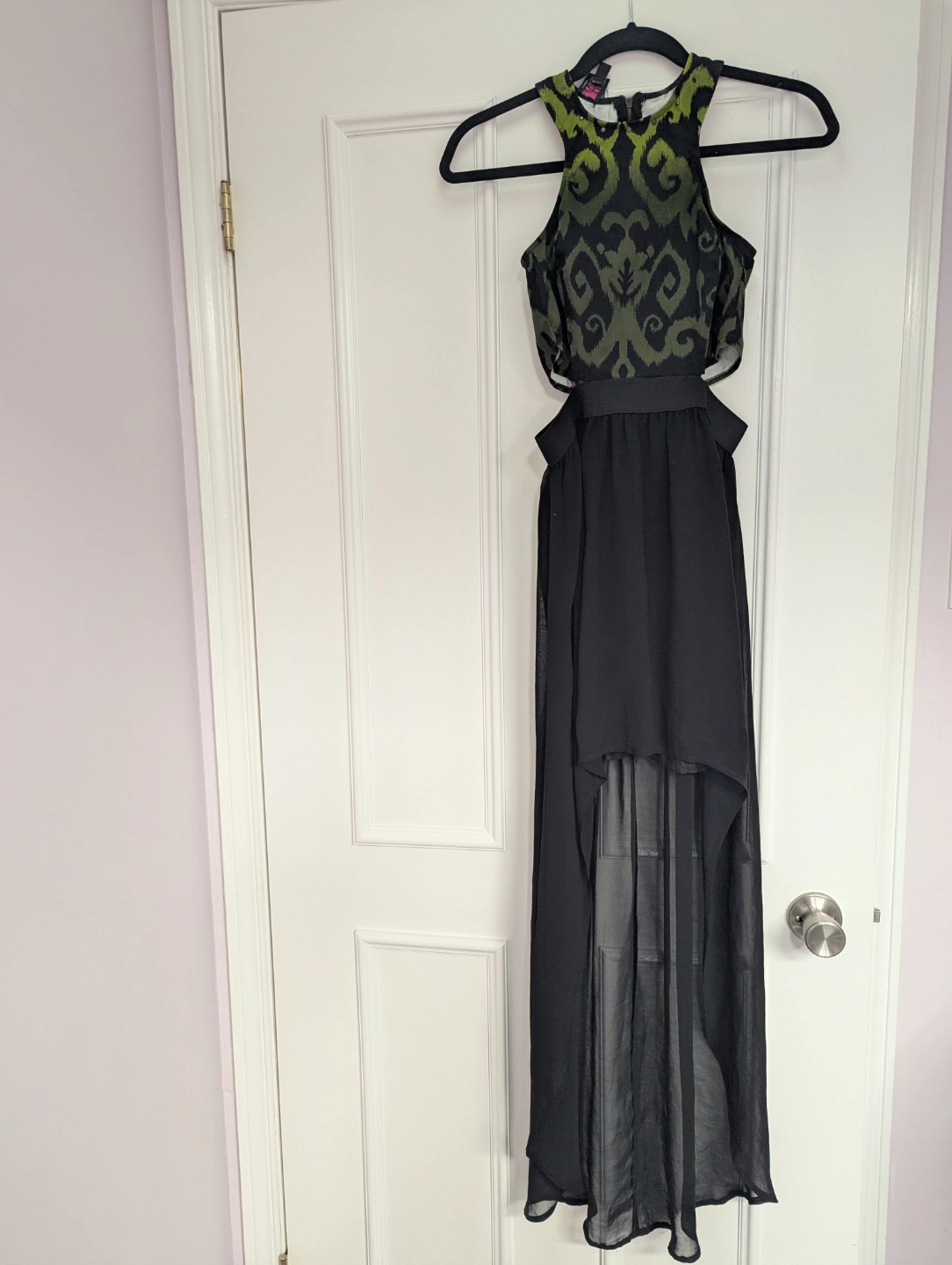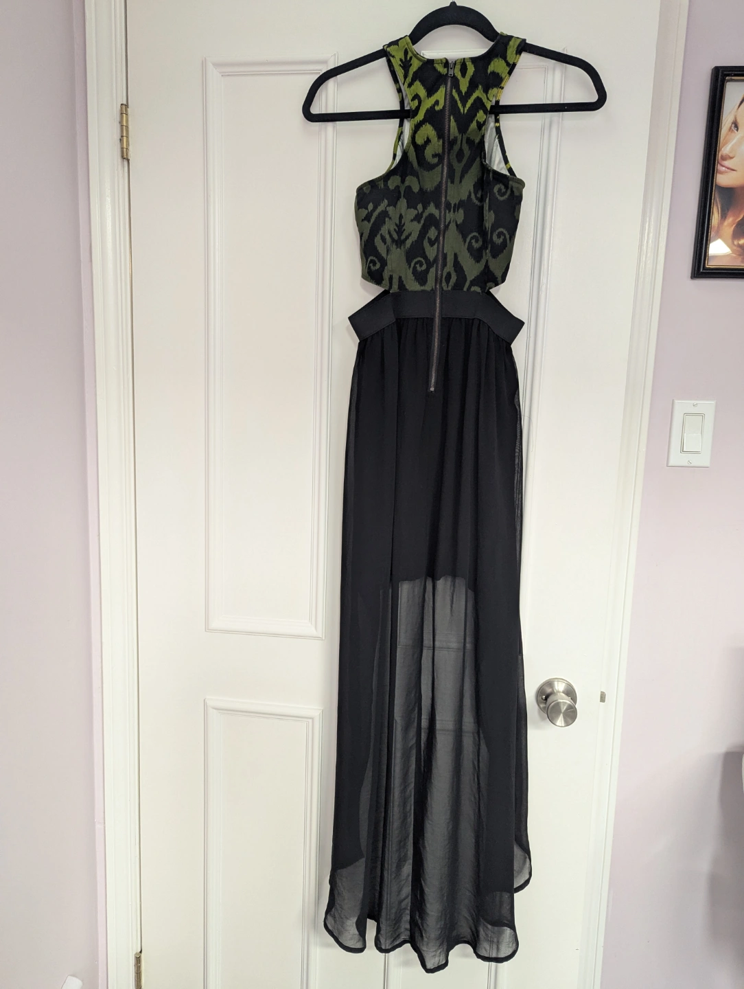 Black high-low dress. Patterned bodice. Cutout detailing. Features zipper closure. A wonderful dress to wear for an evening out. Used in good condition size -S