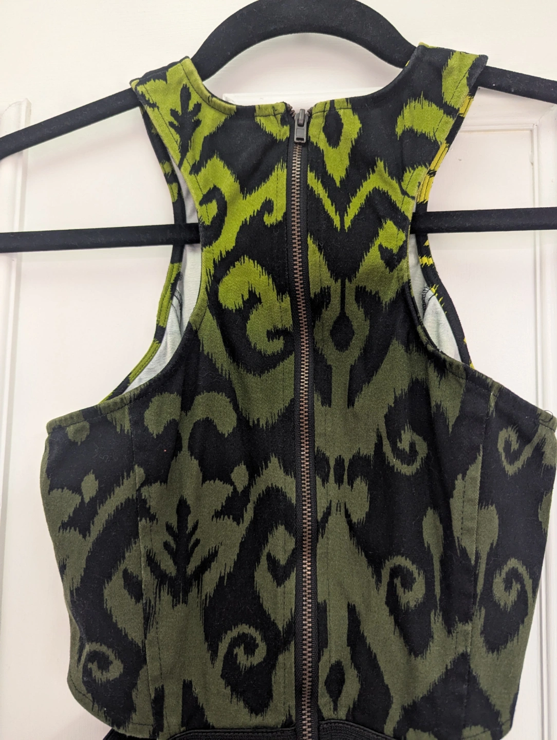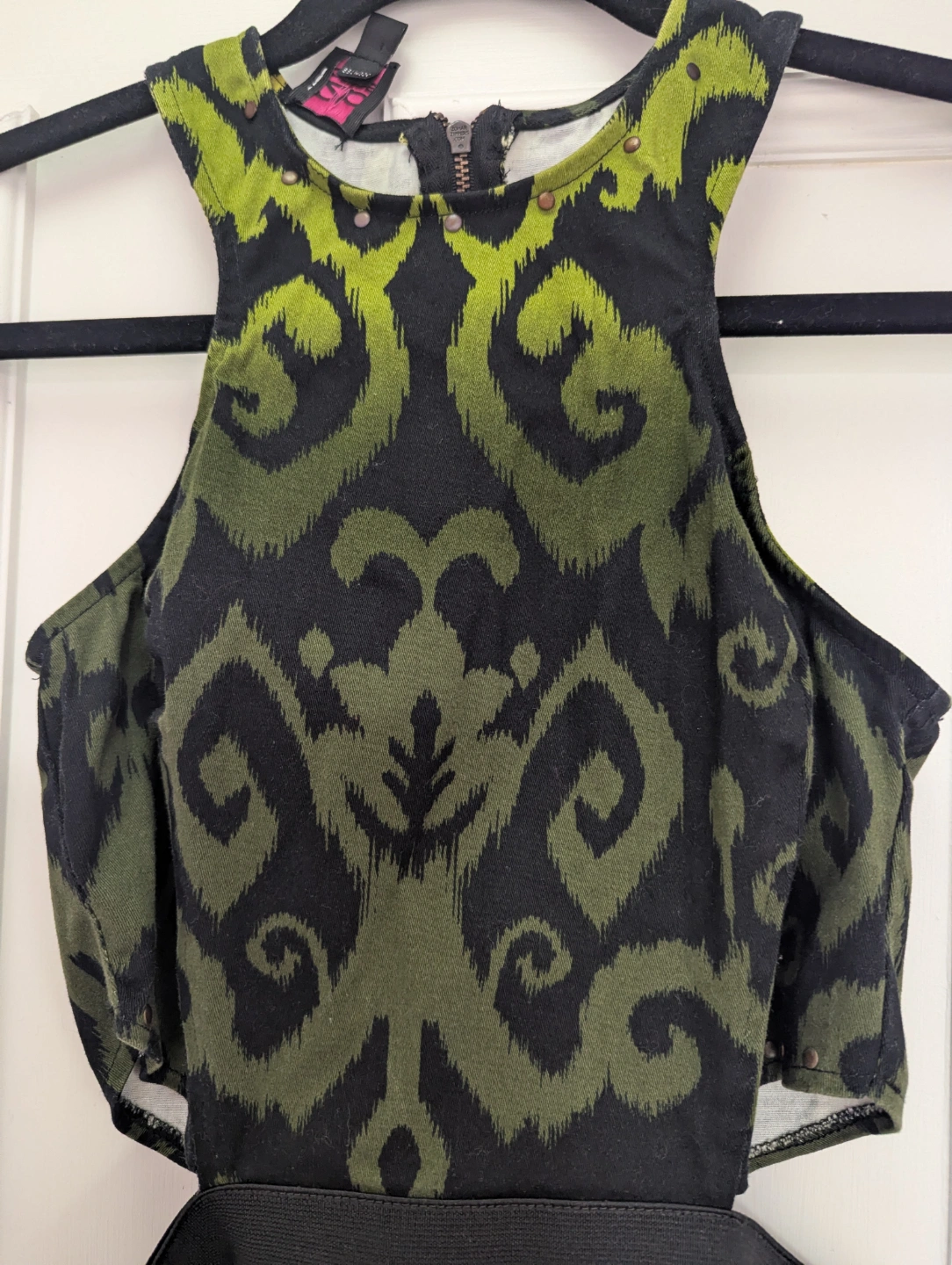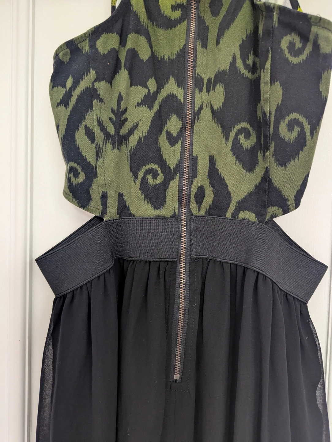 Black high-low dress. Patterned bodice. Cutout detailing. Features zipper closure. A wonderful dress to wear for an evening out. Used in good condition size -S