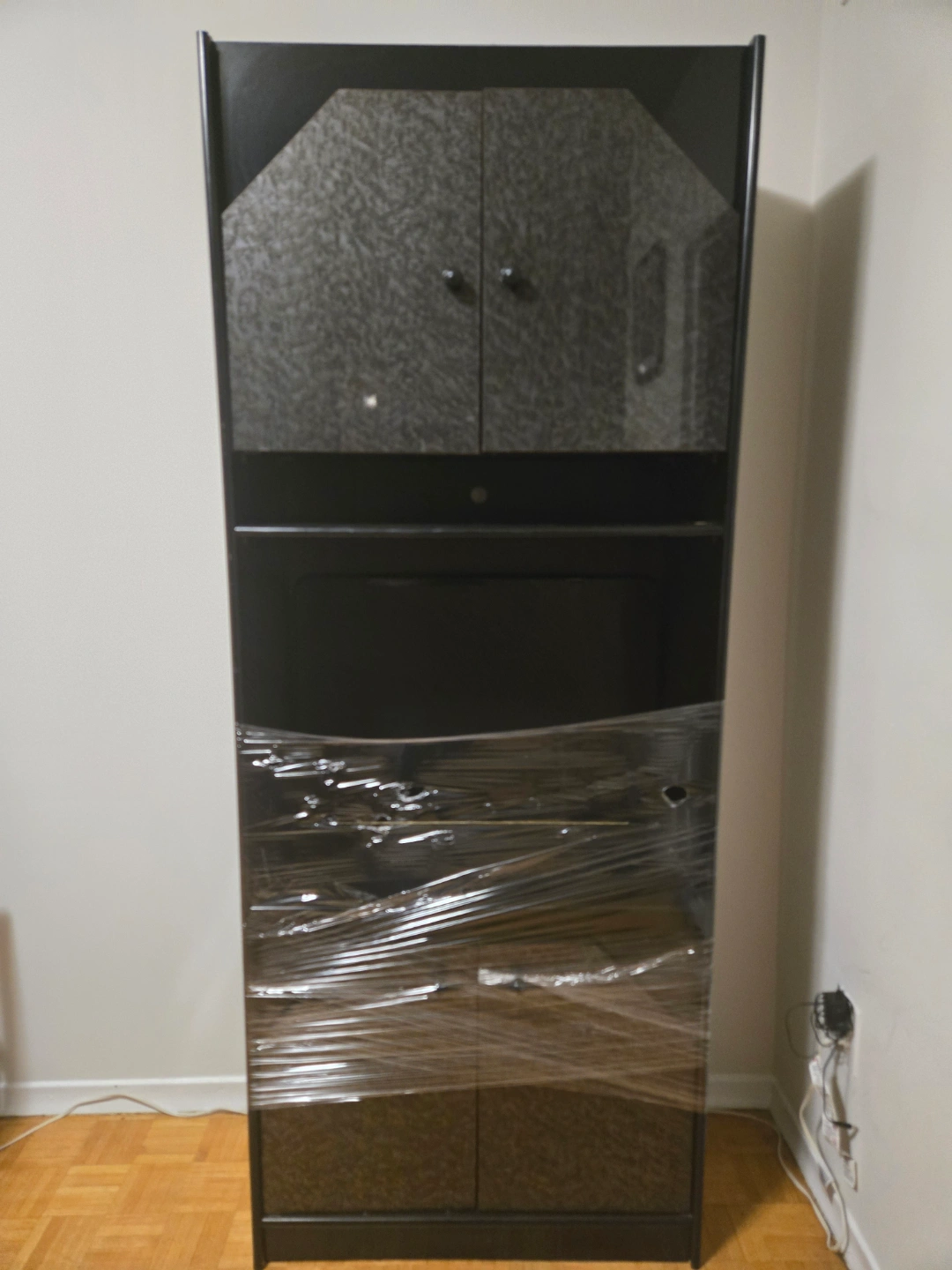 Tall black cabinet. Features several compartments and doors. Upper section with doors has a textured design. A great storage solution to keep a room tidy. pick in north york Victoria and rowena dr