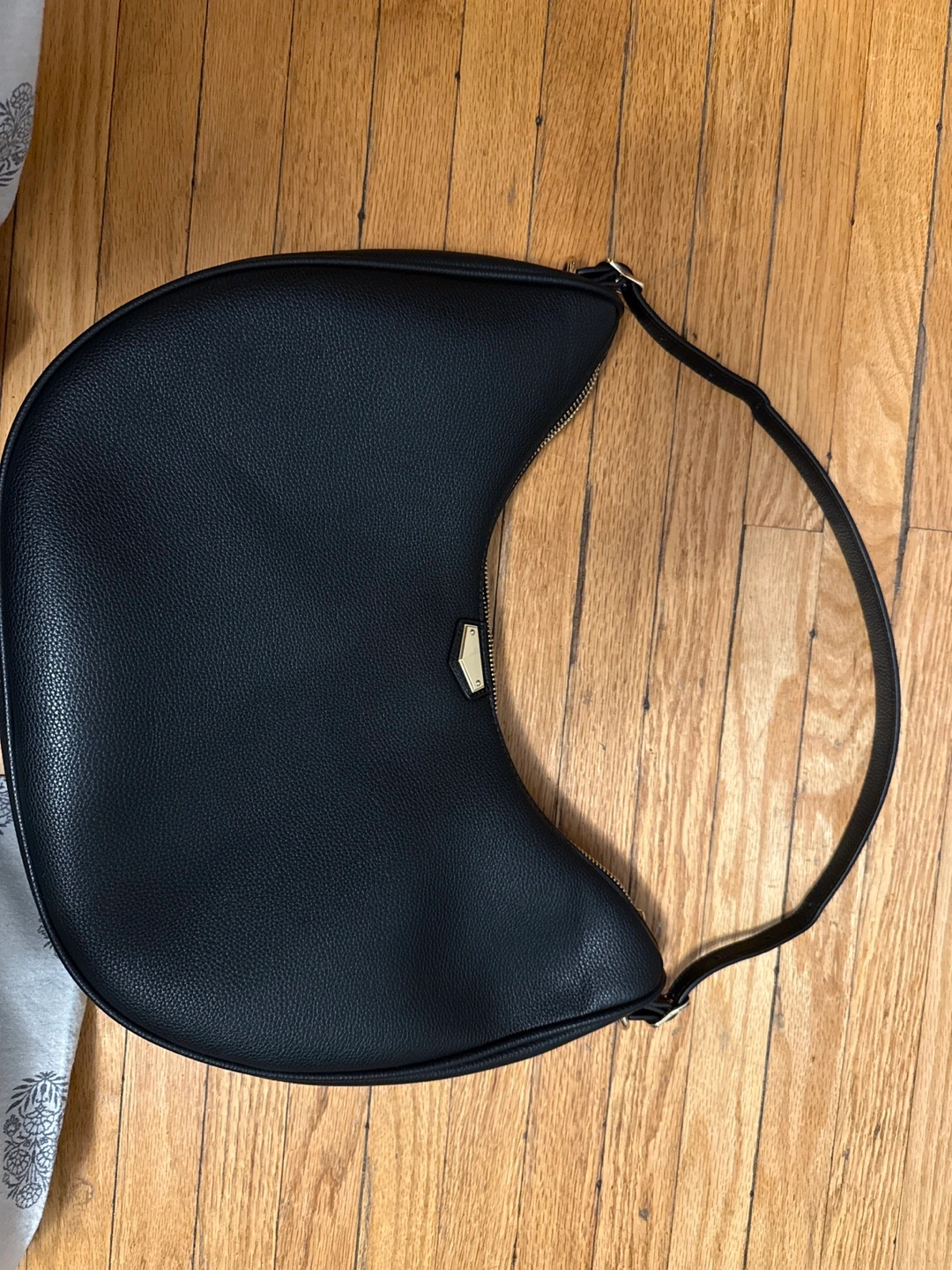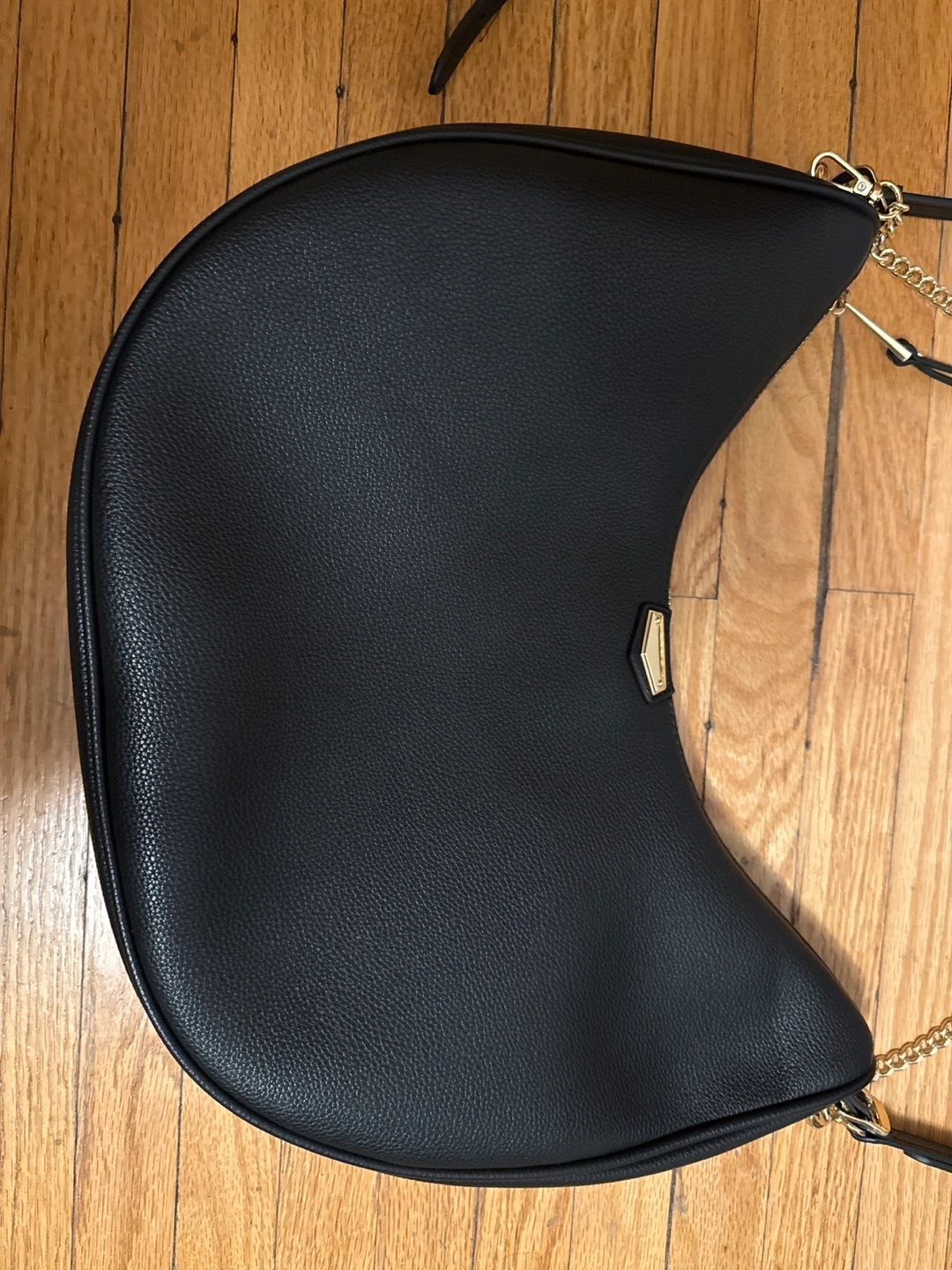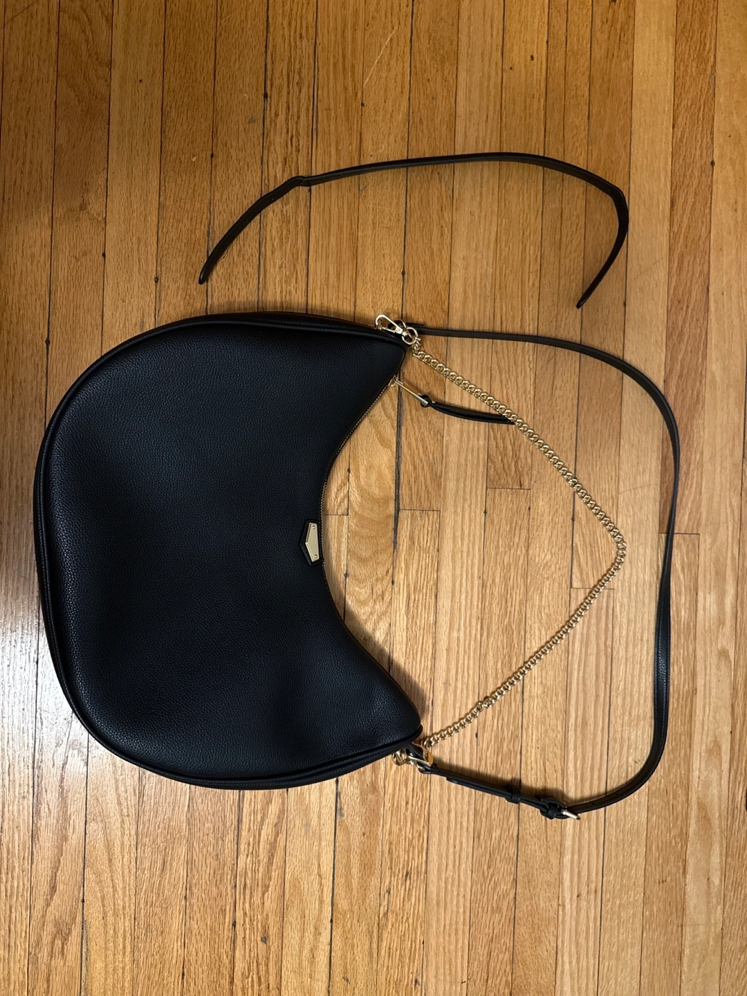 Black, crescent-shaped handbag. Has a gold chain strap. Gold-toned zipper.