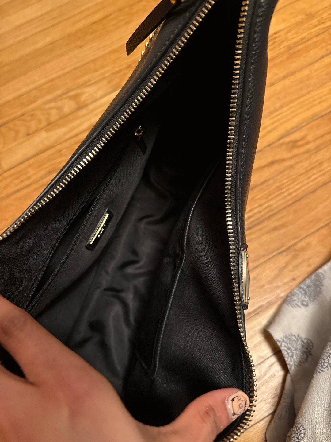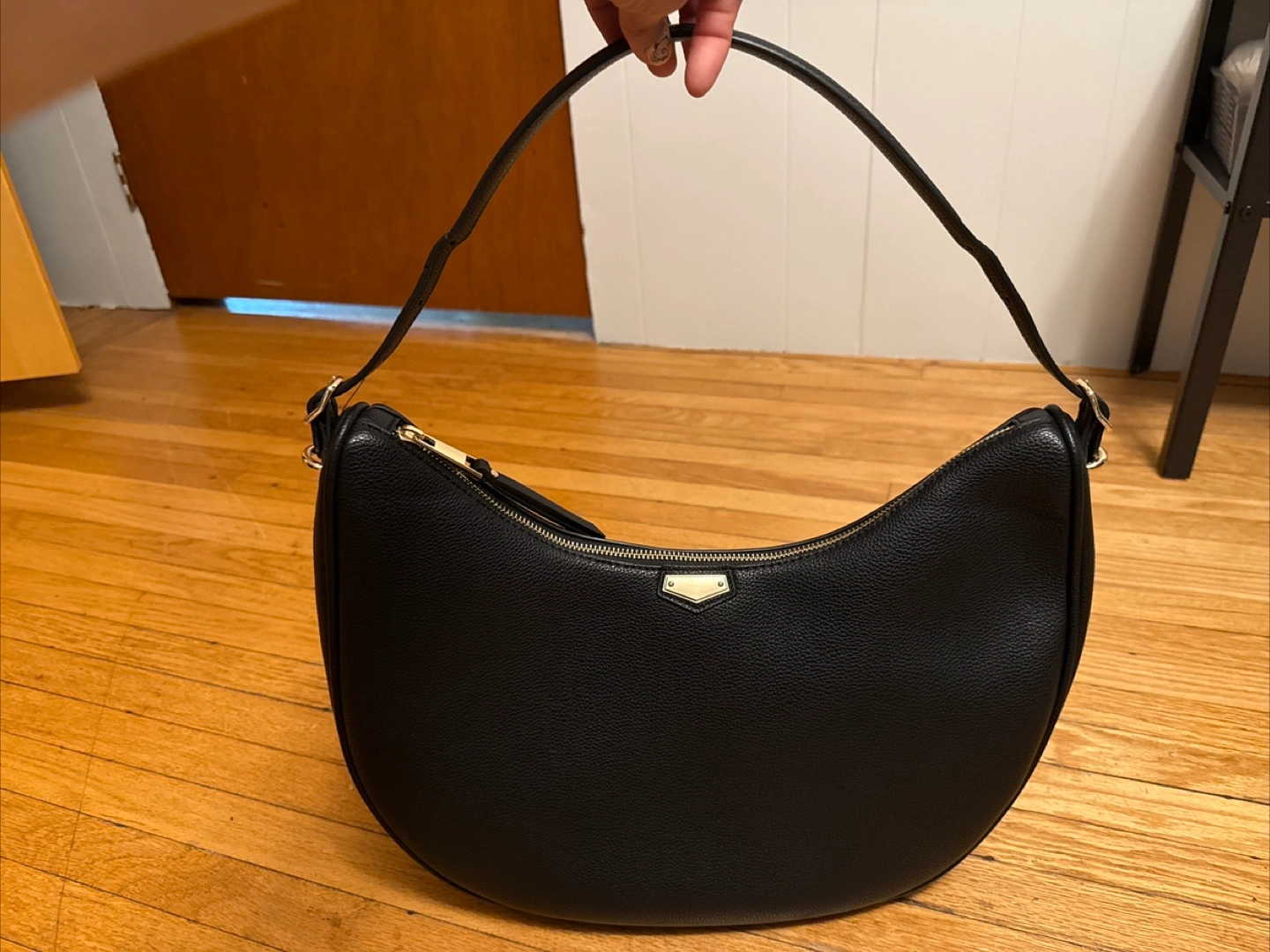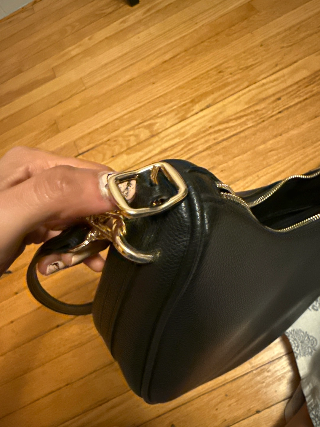 Black, crescent-shaped handbag. Has a gold chain strap. Gold-toned zipper.