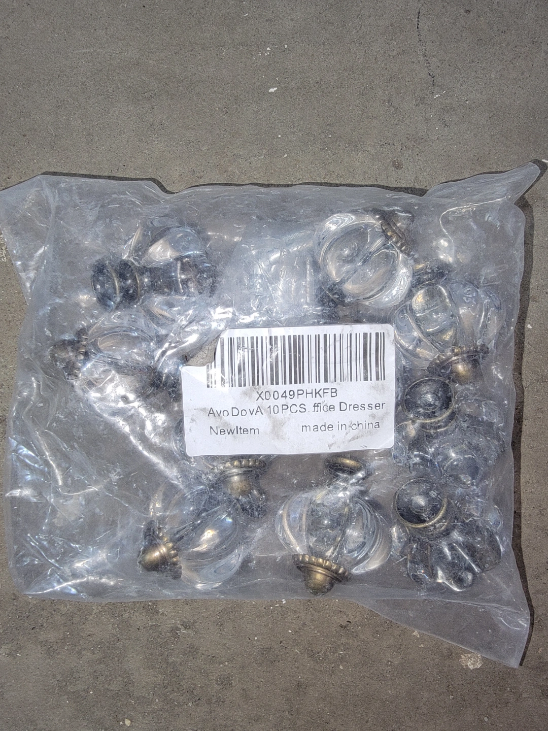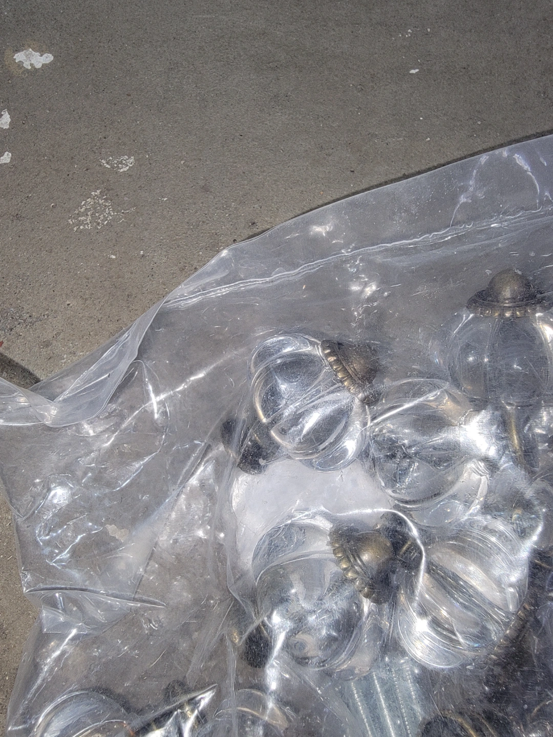 Knobs are in a clear plastic bag. Clear knobs with a decorative design and brass detailing. Could be used on a dresser or cabinet to add a touch of elegance to your space.