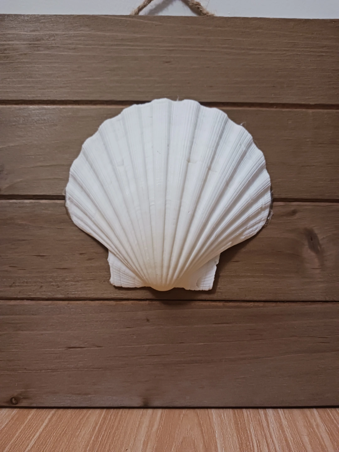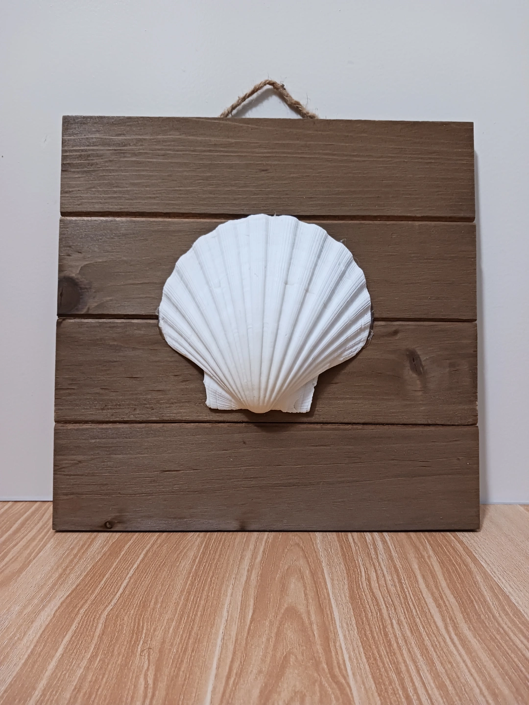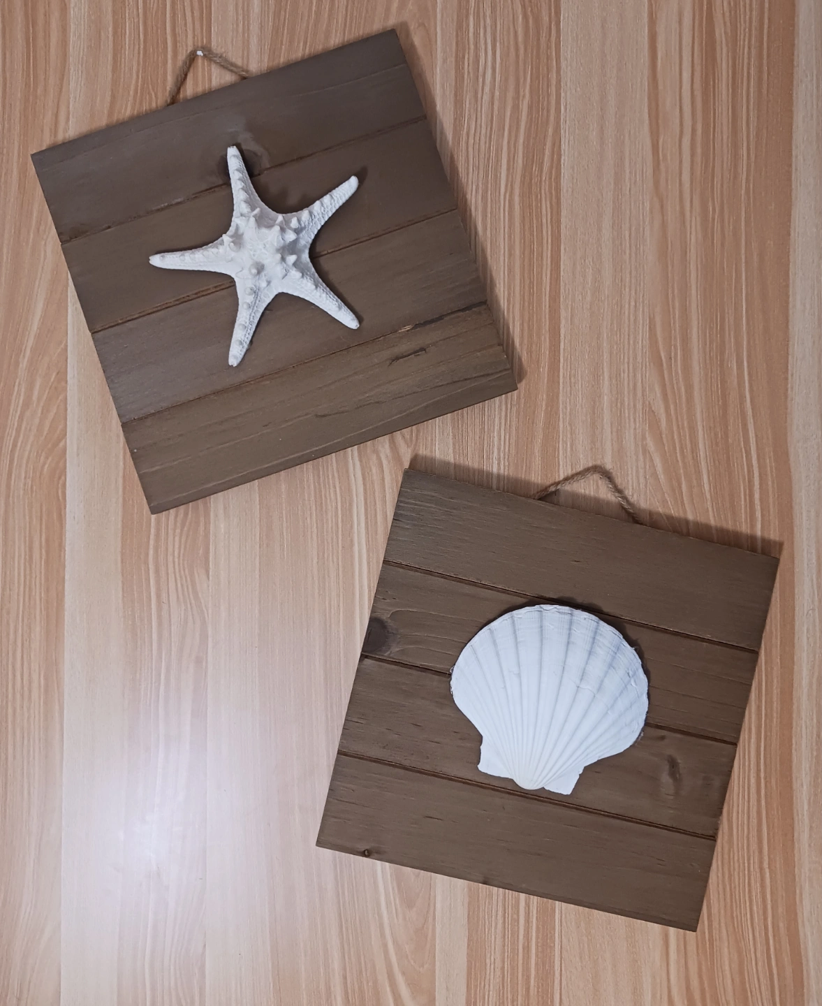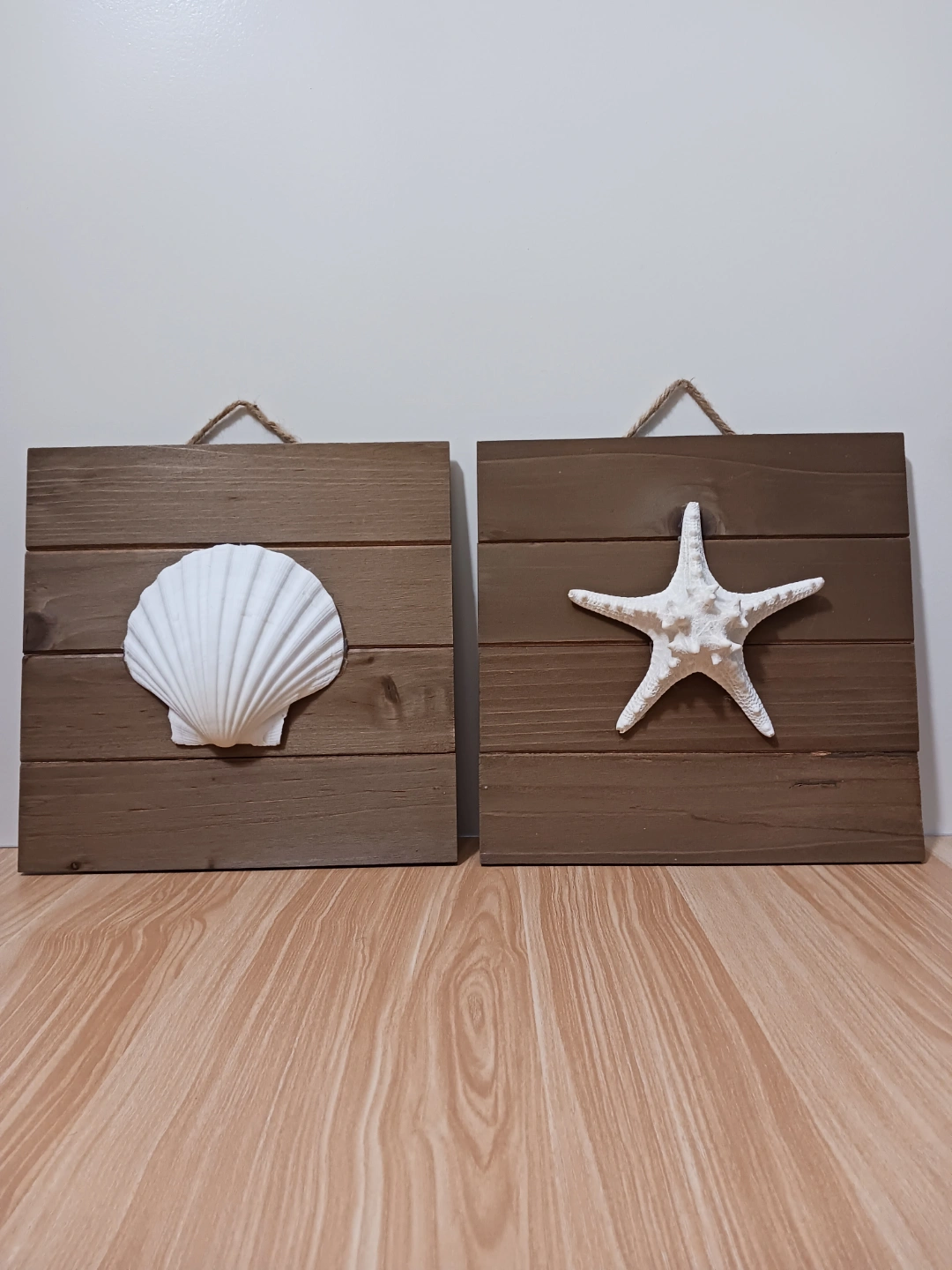 Set of two decorative wooden wall plaques in good condition. Each plaque has a rope for hanging. One features a white shell and the other features a white starfish. Coastal-style decor, great for a bedroom, bathroom, or beach-themed space.