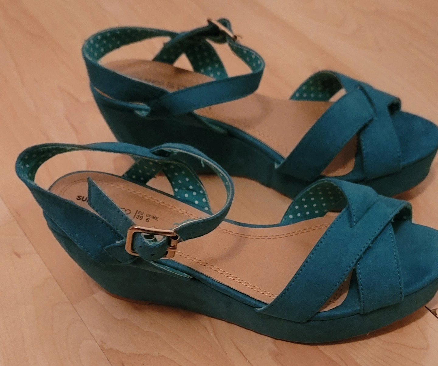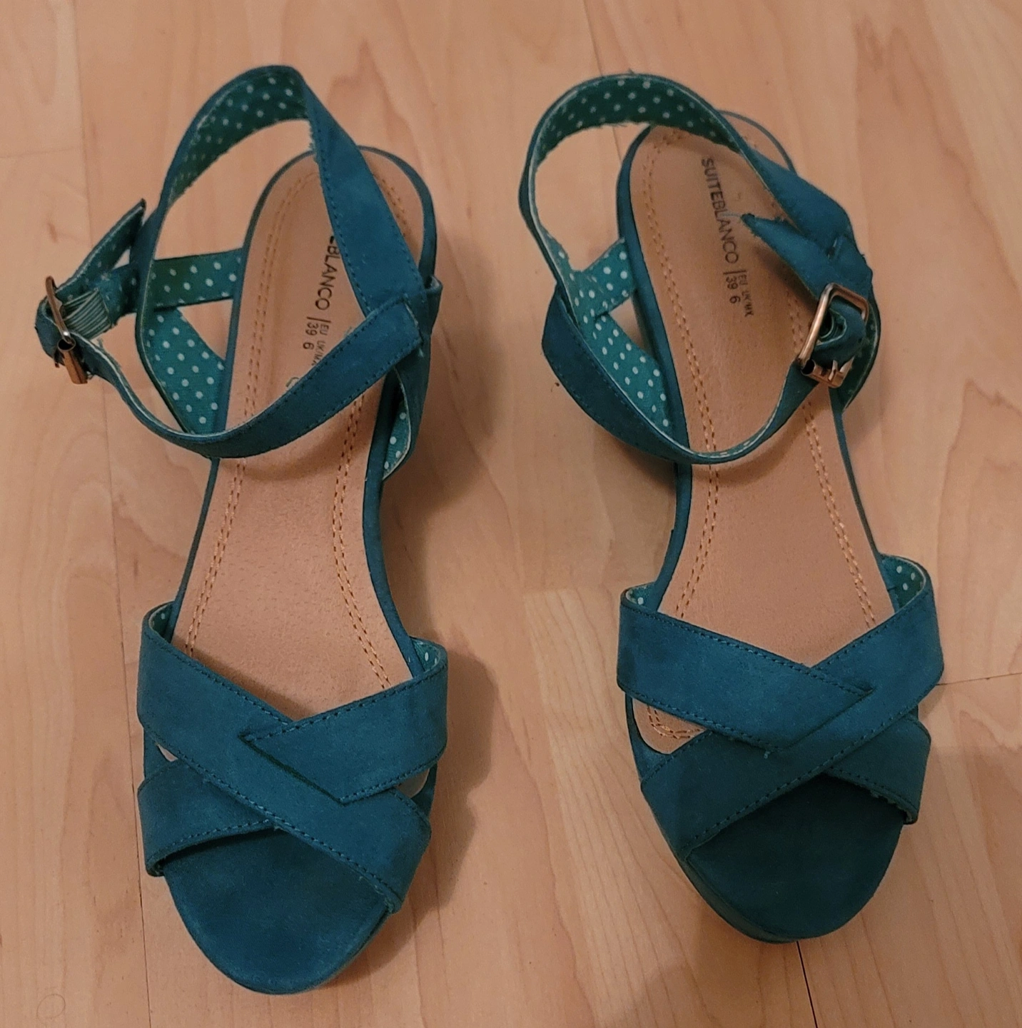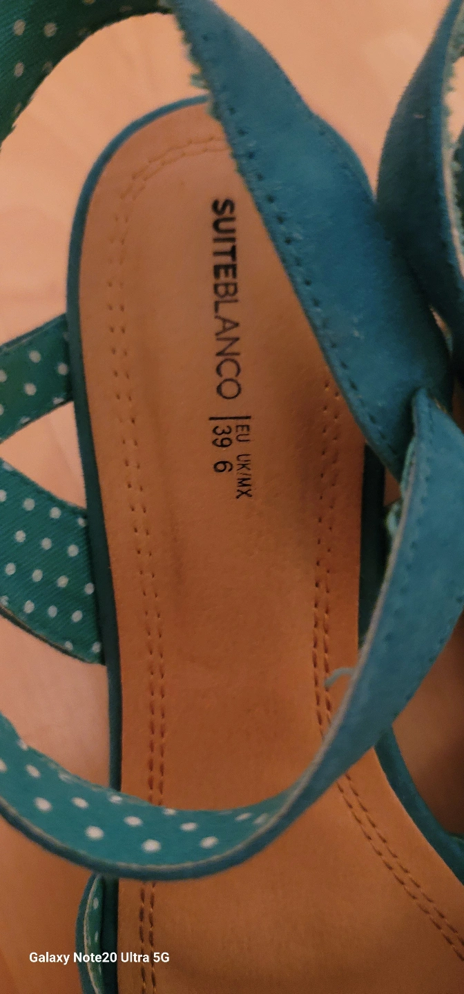 111Teal coloured heels. Featuring a strap that goes around the ankle. The heels are wedged. They would be lovely for a stroll on a sunny day.