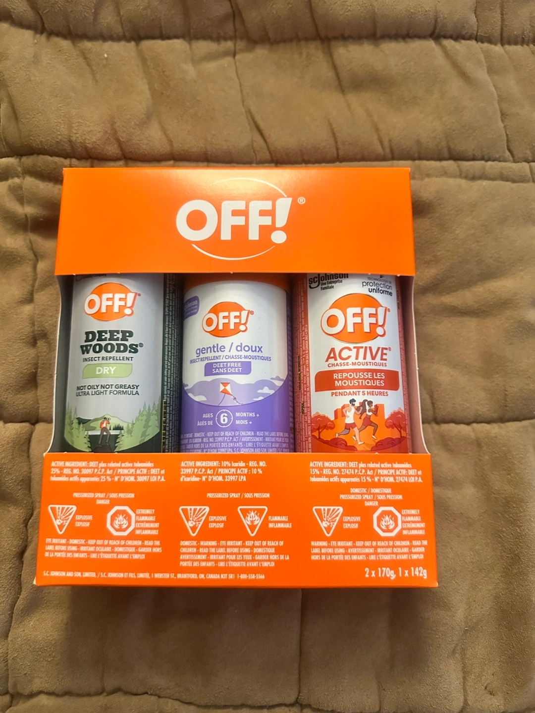 Set of three cans of insect repellent. Includes Deep Woods, gentle, and active repellents. A helpful companion for outdoor relaxation.