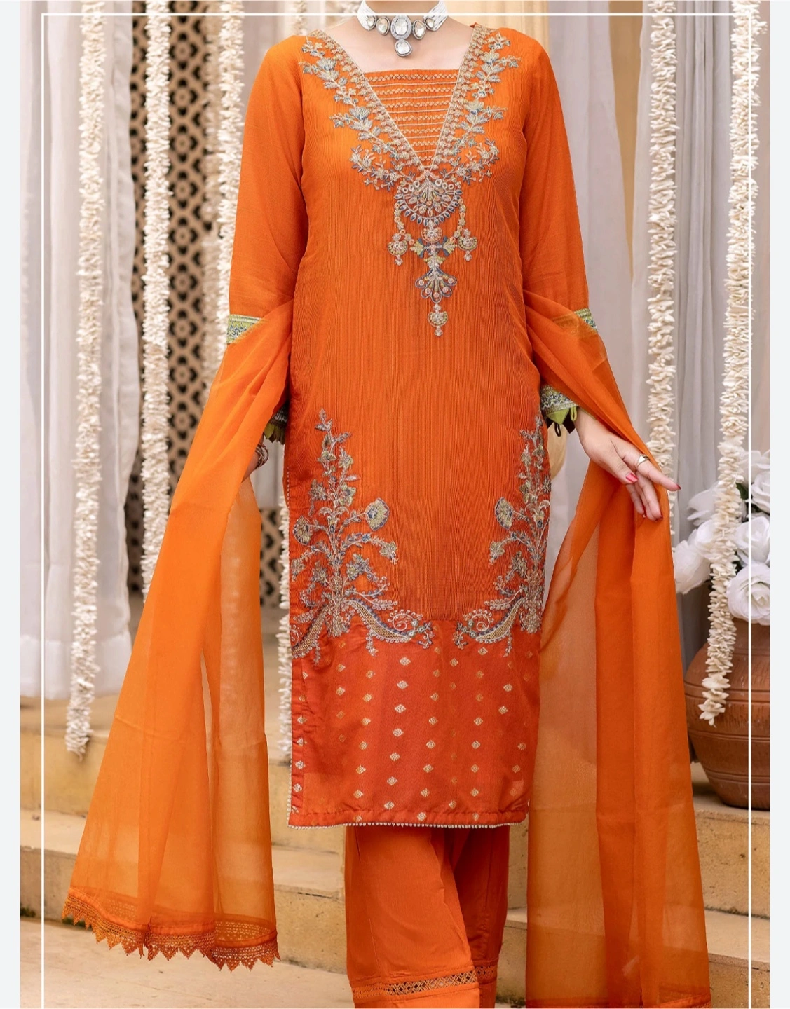 Long-sleeved ensemble in a vibrant orange colour. Embellished embroidery throughout. Includes matching trousers and a sheer scarf. A great outfit to feel comfortable and look elegant.