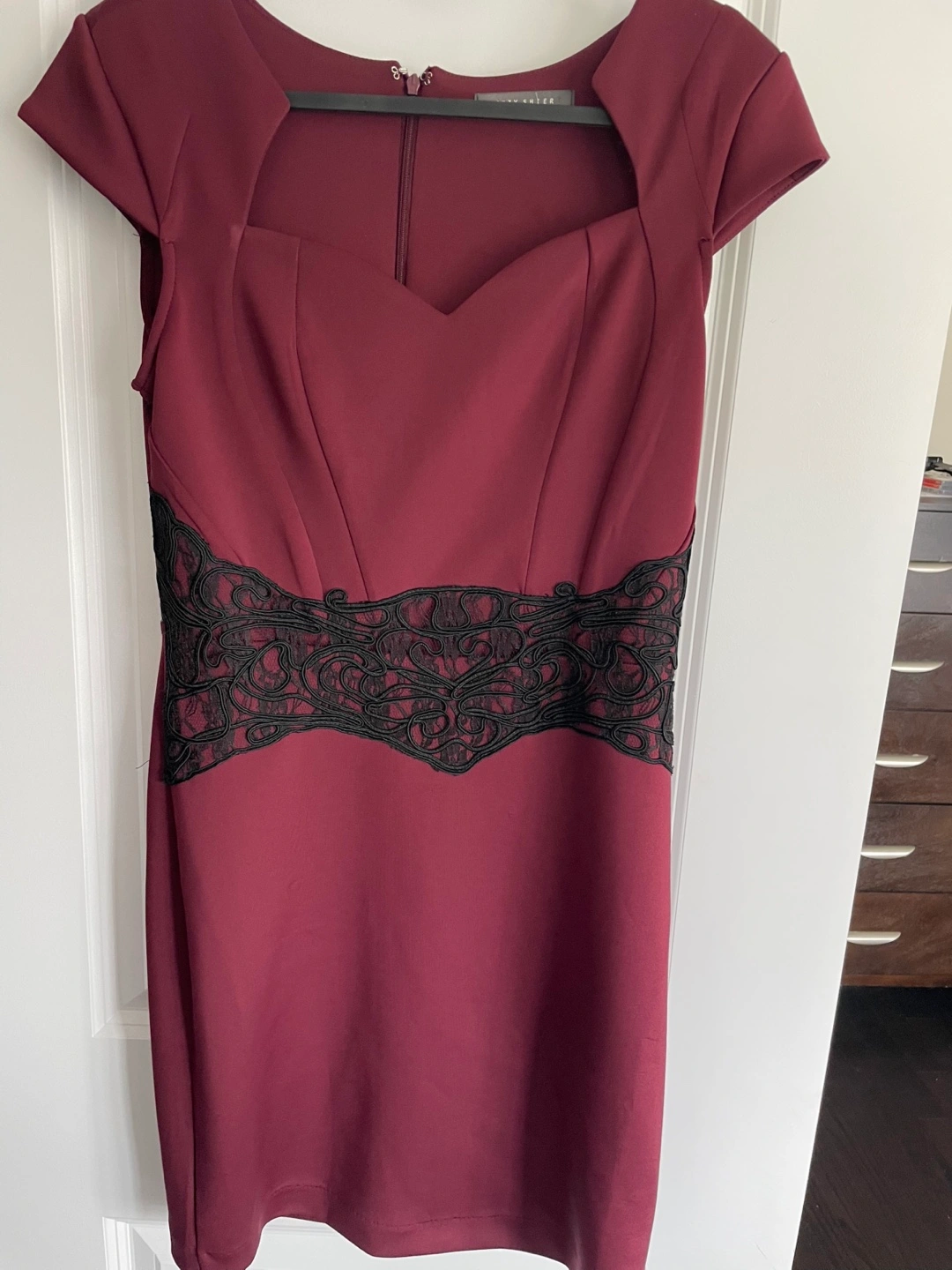 Dress in a burgundy color. Features a scoop neckline. Black lace design on the waist. A nice dress for a night out, helping you feel comfortable and confident.