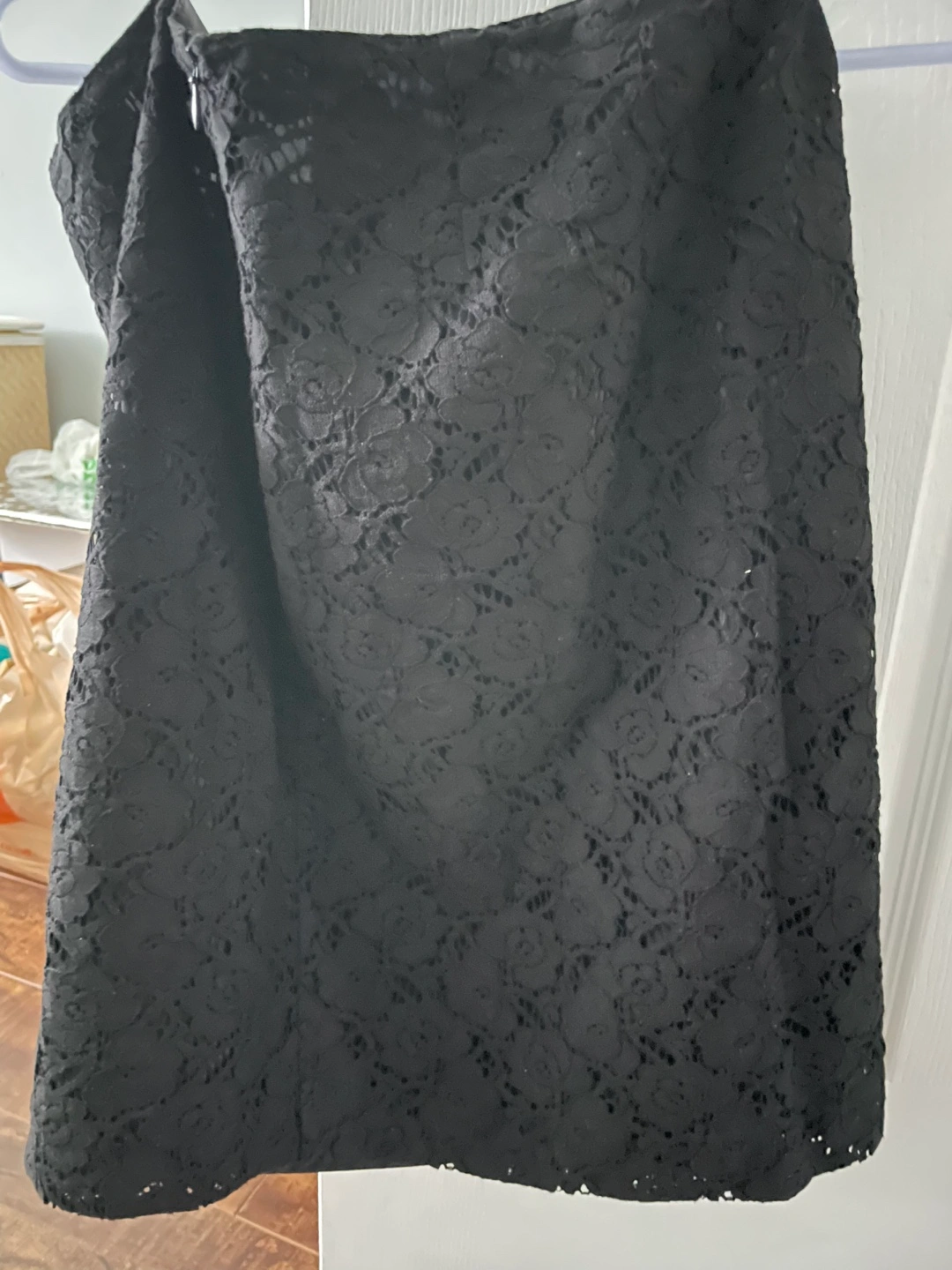 Black lace skirt with a subtle floral pattern. Features a side zipper. A skirt like this is perfect for a date night out or a special occasion.