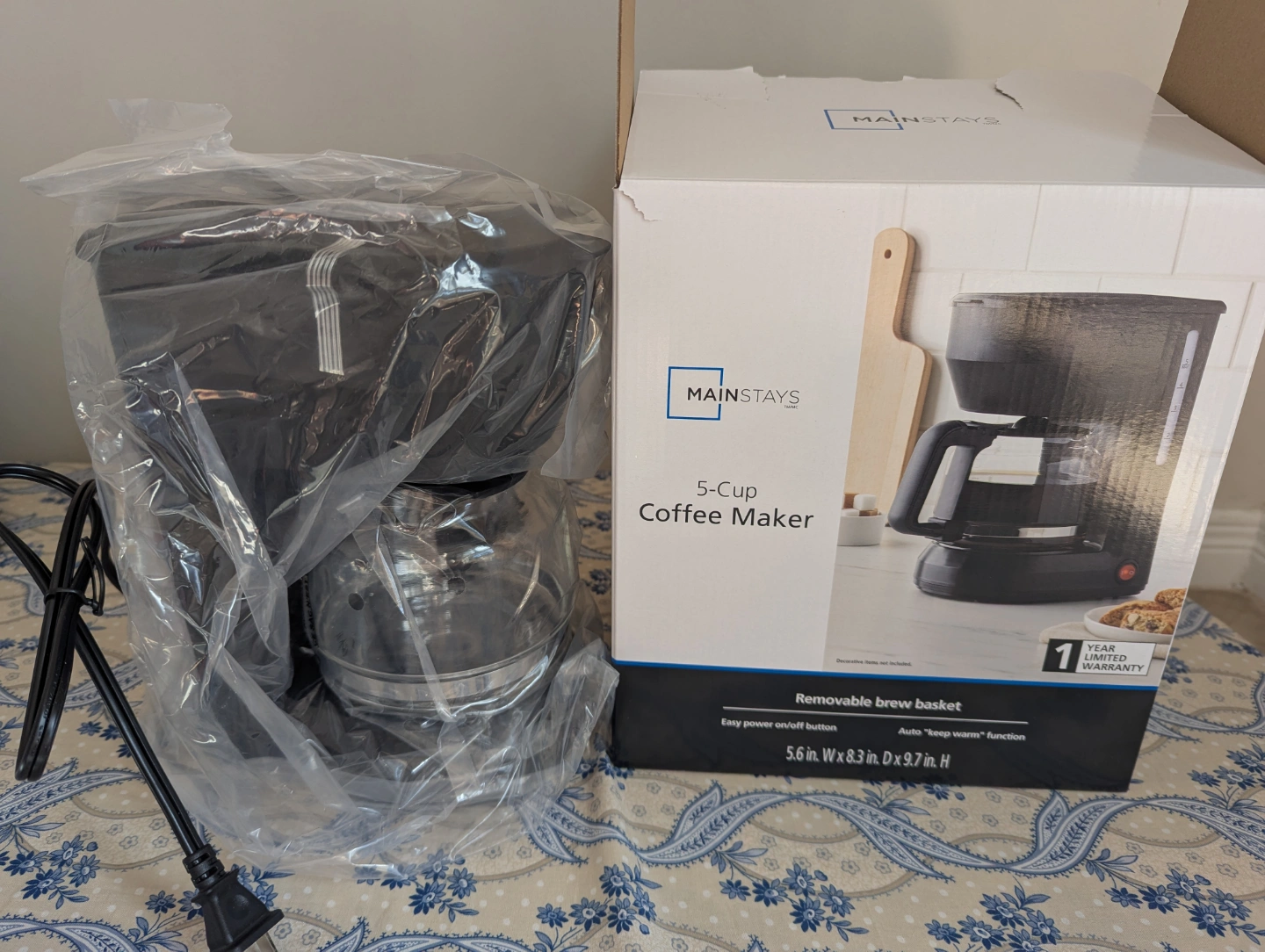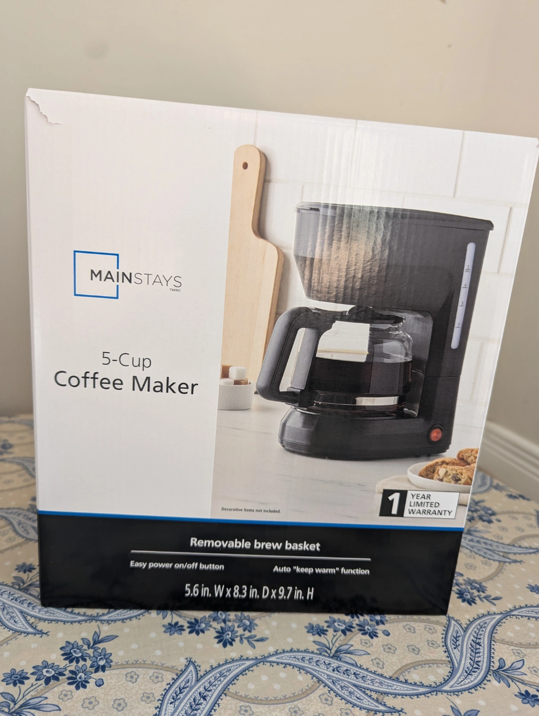 Coffee maker in its original packaging. It includes a glass carafe and black exterior. A removable brew basket is also included. Brewing coffee is a great way to start your day peacefully.