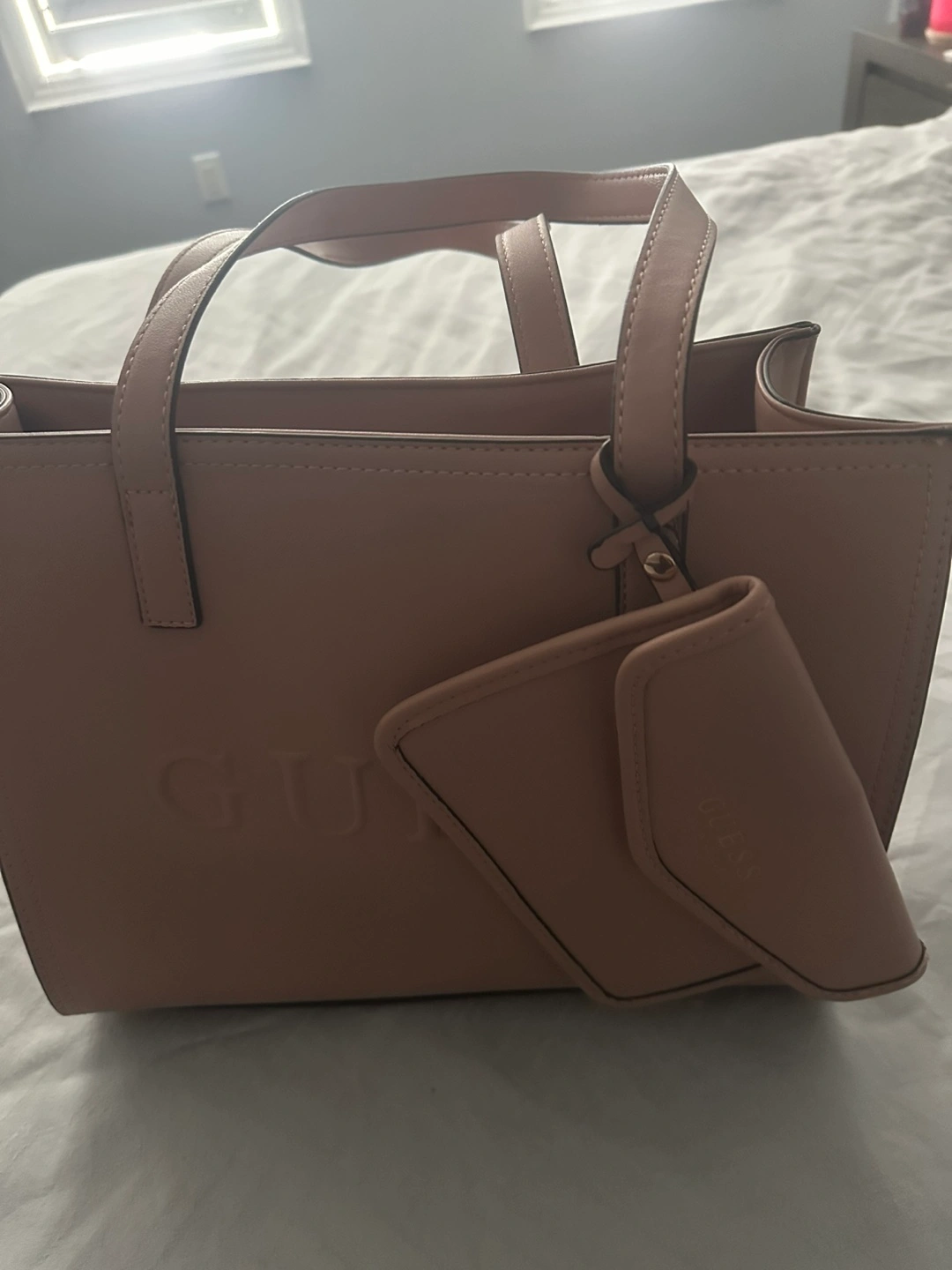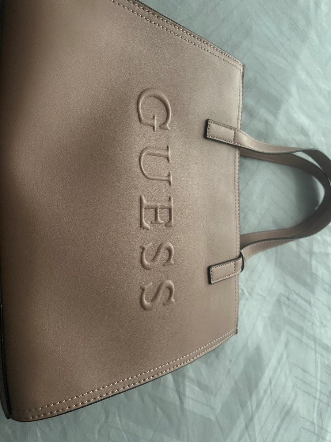 10Beige tote handbag. Features dual handles and a small attached pouch. Embossed brand logo on the front. Great for bringing your essentials with you.