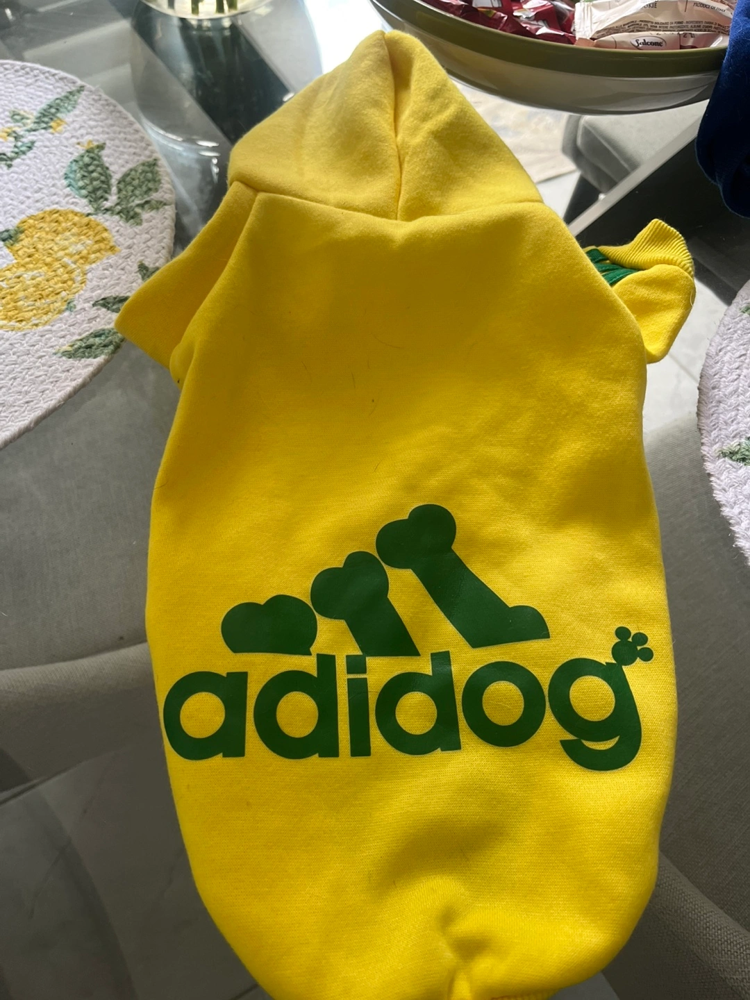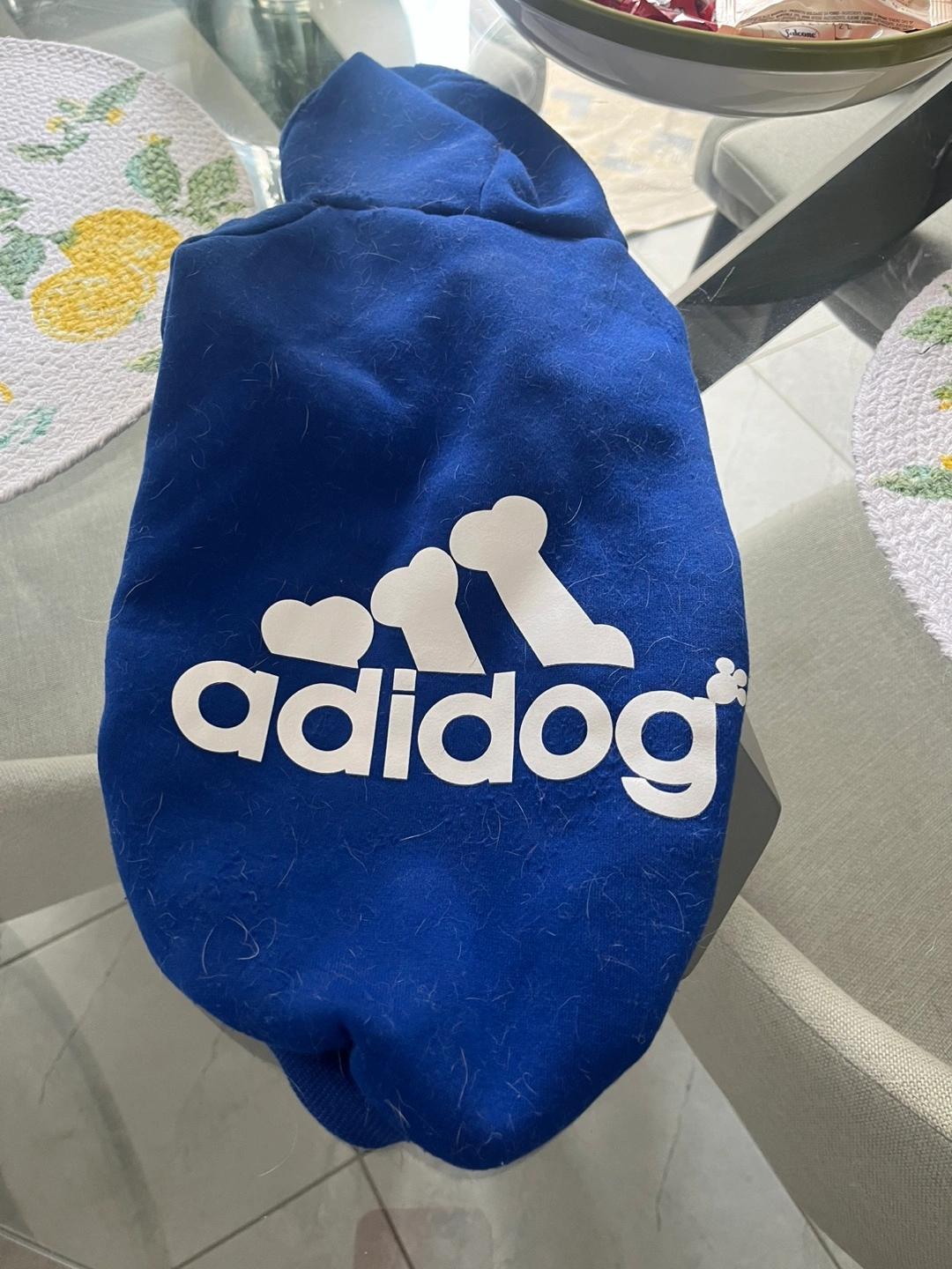 10Hoodie for your dog. Features a hood and the Adidog logo. A comfortable hoodie to make your dog feel cozy.