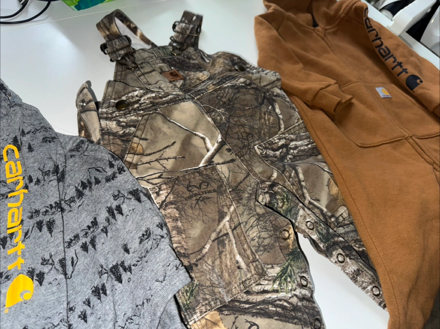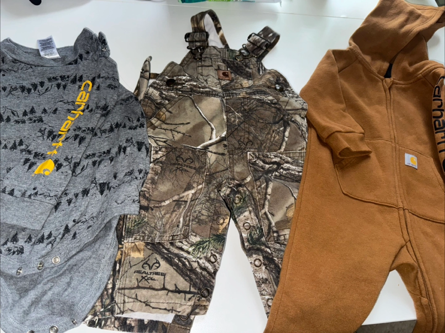 A collection of baby clothes. Includes a long-sleeve shirt, overalls, and a hooded jumpsuit. All items in the bundle are perfect for creating a cozy, relaxed outfit for your baby.