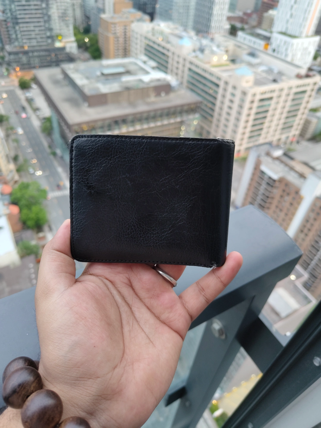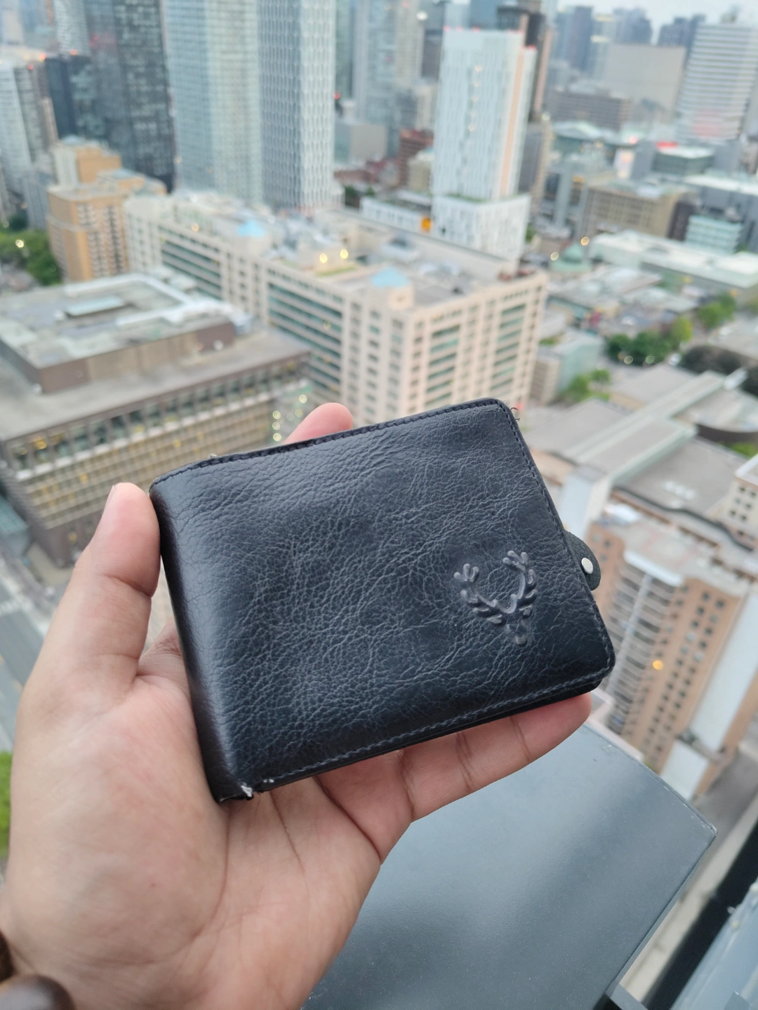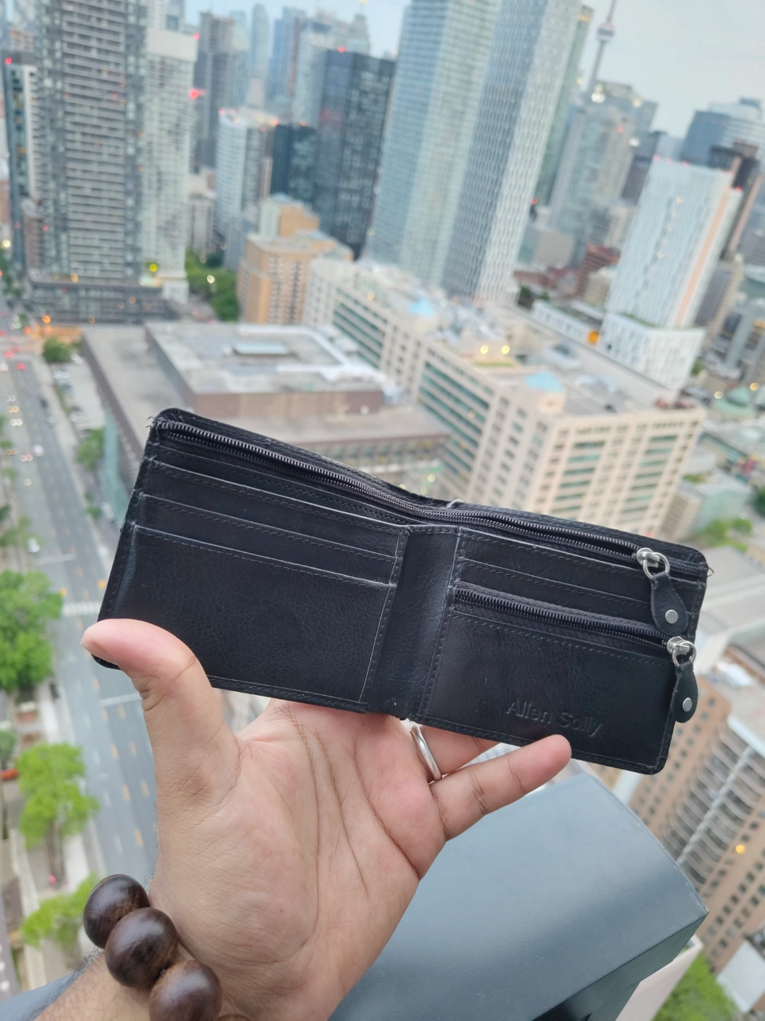Black wallet. Made of leather. Zippered pockets. Compartments for change, cards and bills. A great way to keep your cards and money safe and organized.