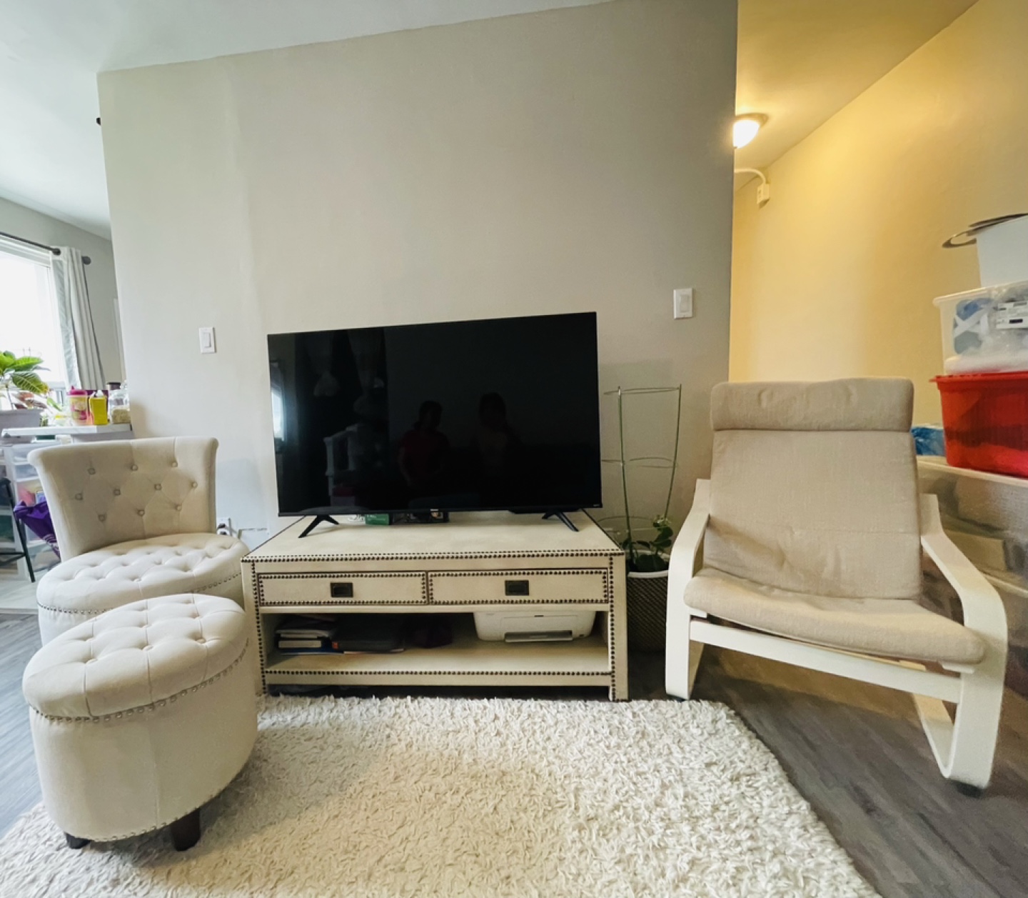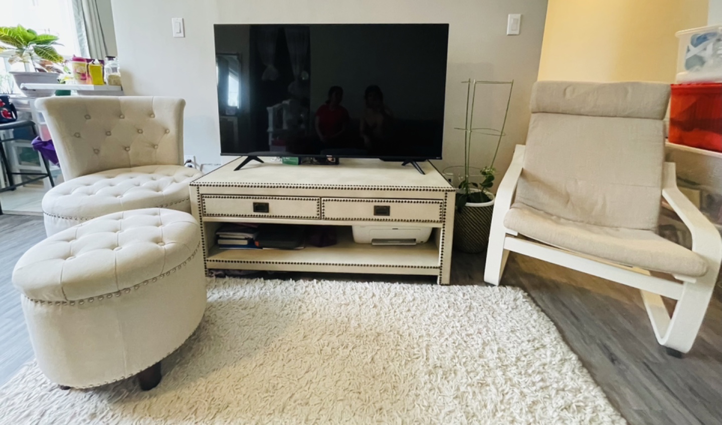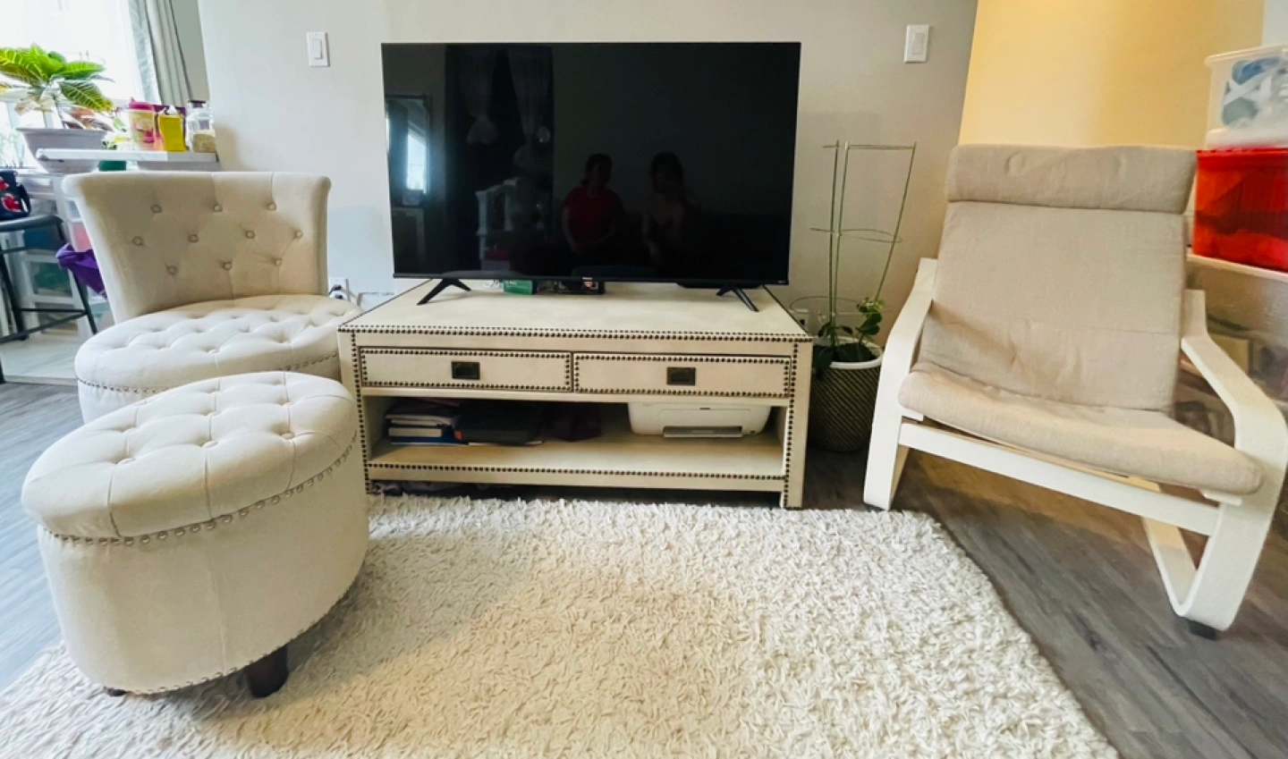 The set includes a TV stand, arm chairs, and an ottoman. There is also a grey sectional sofa and a rug. Consider this furniture set the beginning of a cozy living space.