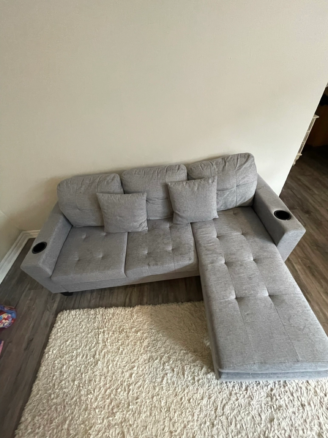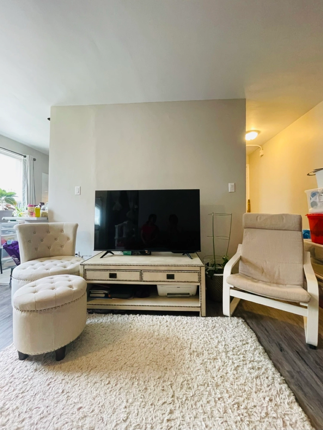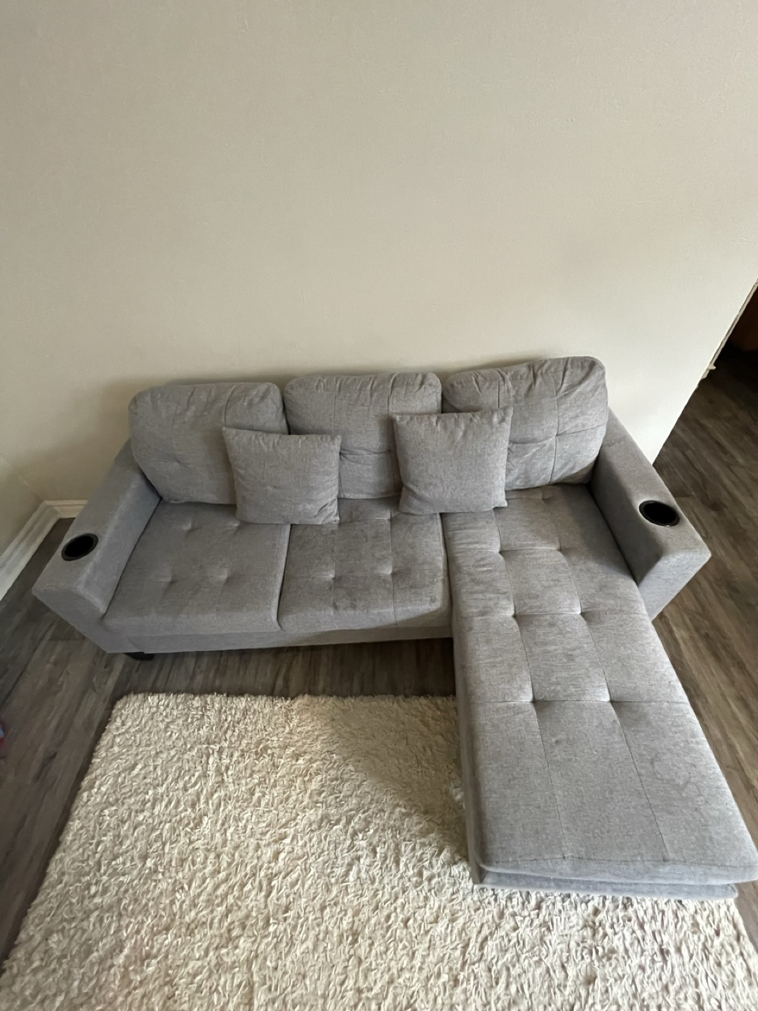 The set includes a TV stand, arm chairs, and an ottoman. There is also a grey sectional sofa and a rug. Consider this furniture set the beginning of a cozy living space.