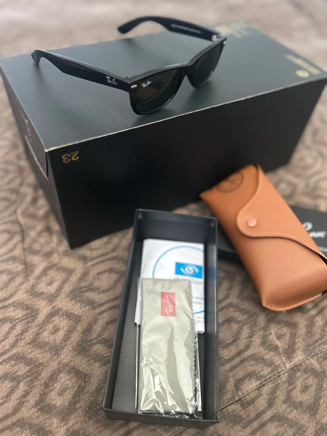 Sunglasses with a black frame. Includes a case, cleaning cloth, and other accessories. Sunglasses are perfect for a day at the beach. Brand new. Comes with both prescription lenses and original polarized lenses. Asking for $110 OBO