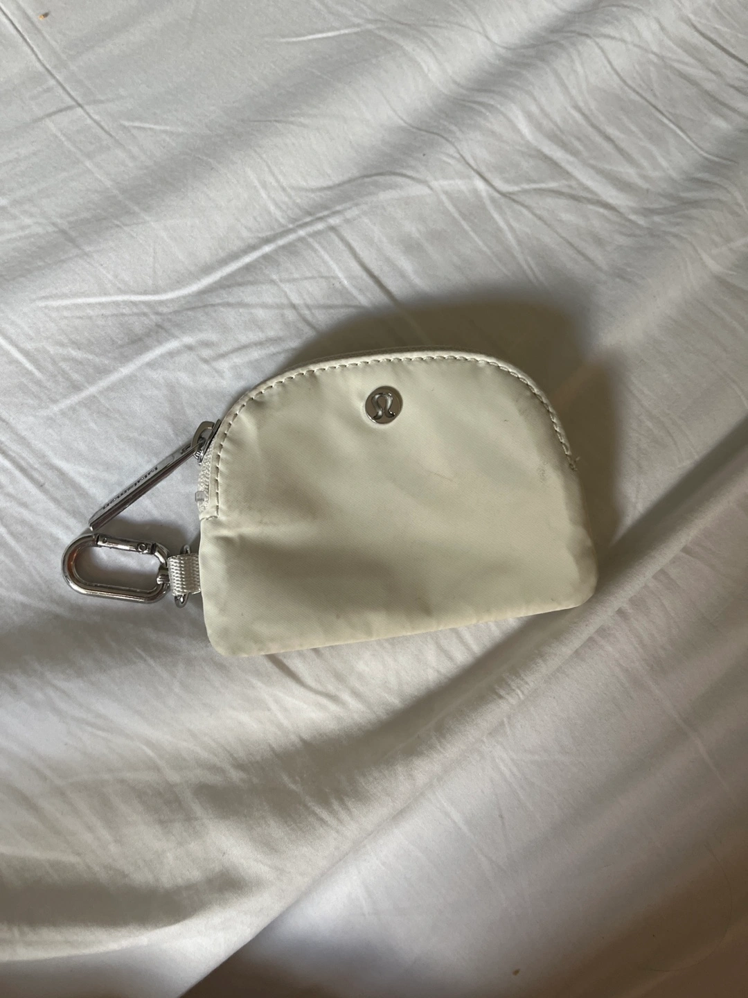 Cream-coloured, semi-circular pouch. Has a zipper closure. Comes with a silver carabiner. A great way to keep your small essentials together.