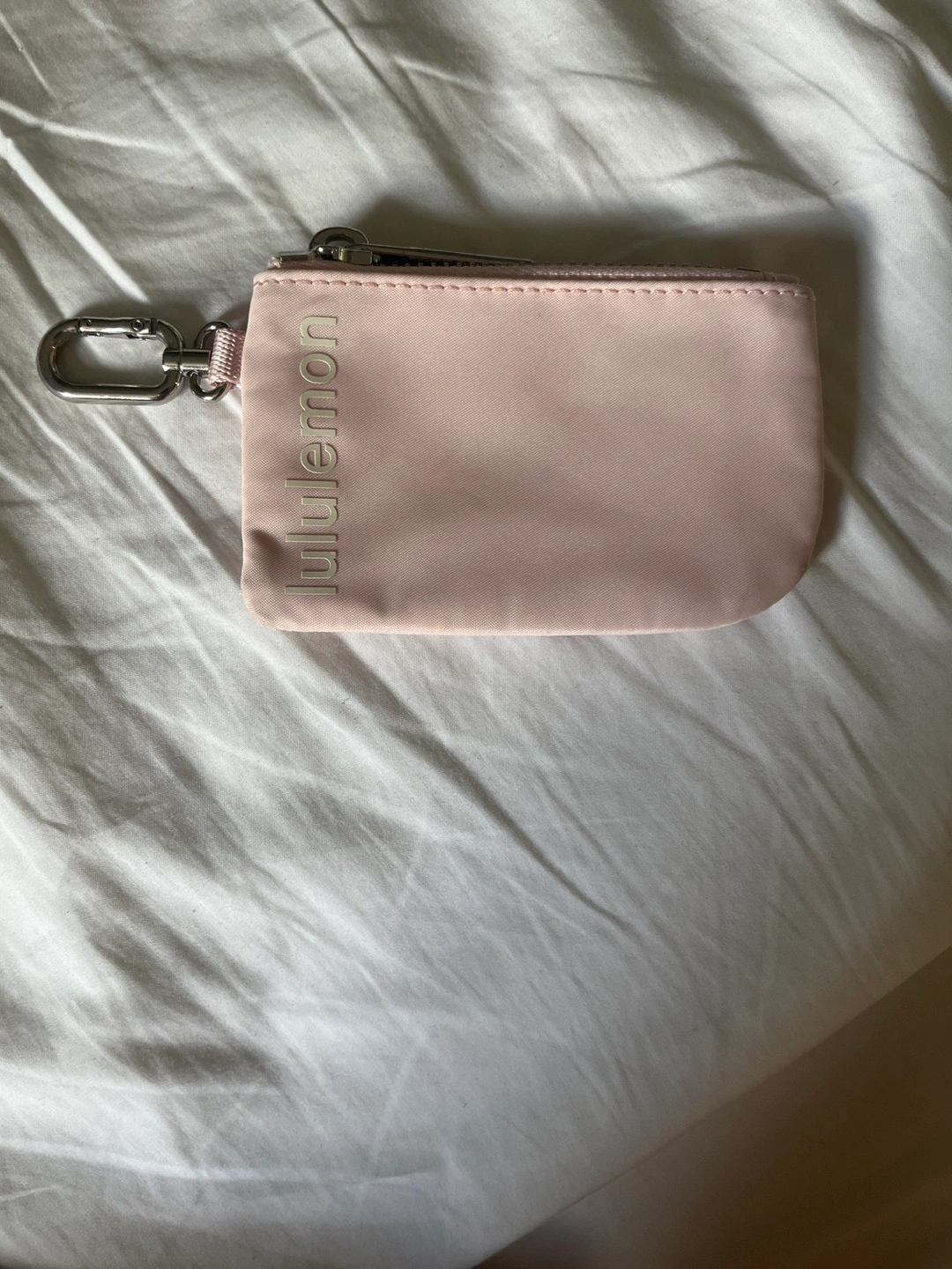Pink pouch. Zip closure. Metal hardware. Small size. Would be useful for keeping your essentials organized and within reach, helping you feel more grounded.