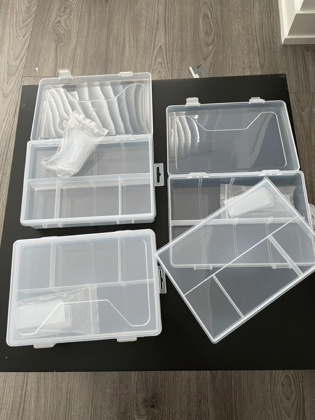 3x Clear plastic storage boxes. Several compartments inside. Great for organizing small items. These boxes can help you stay organized and find things easily.