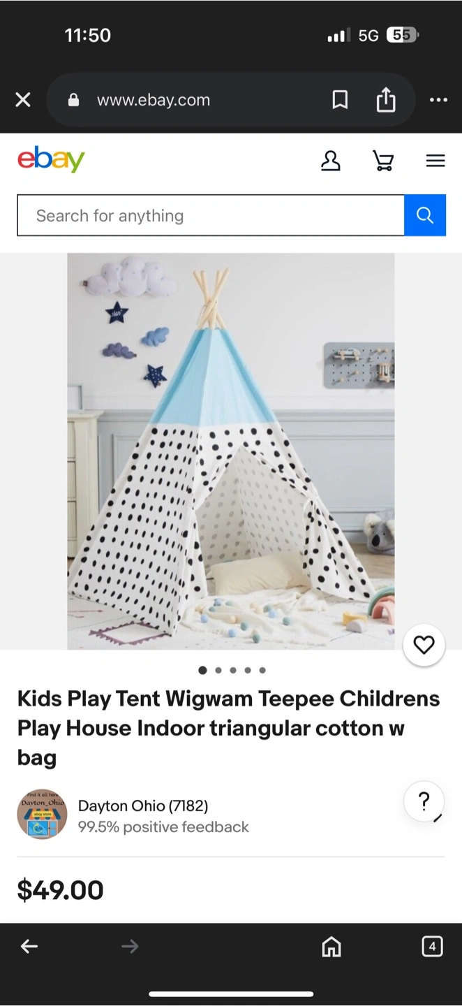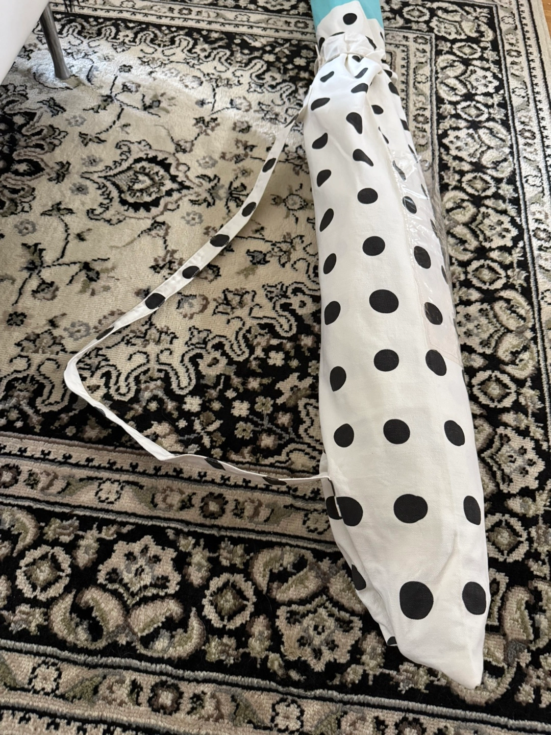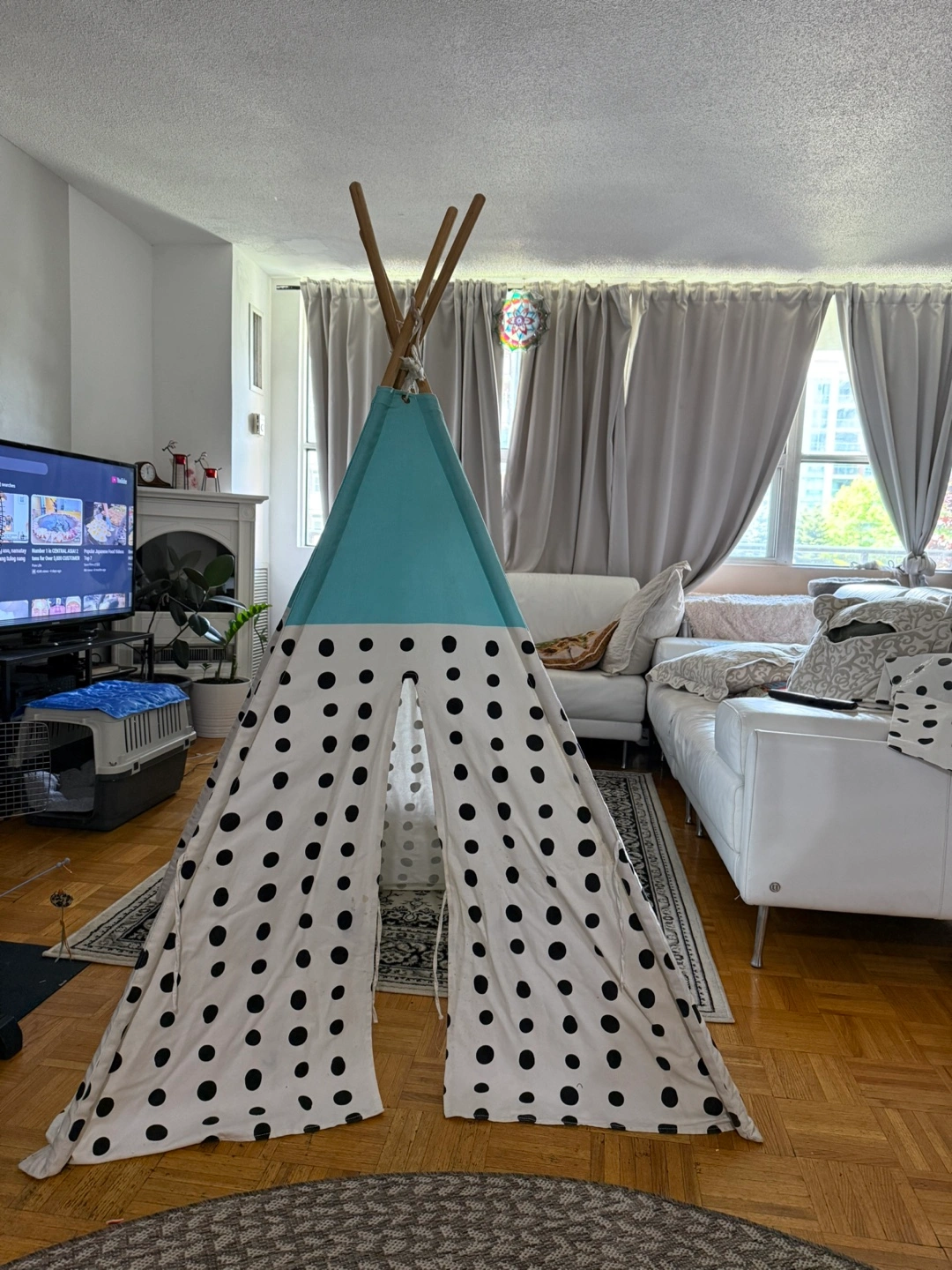 Teepee with a fun polka dot pattern. Features a light blue top. Comes with a carry bag so you can easily fold it up. A great space for children to relax and enjoy some alone time.