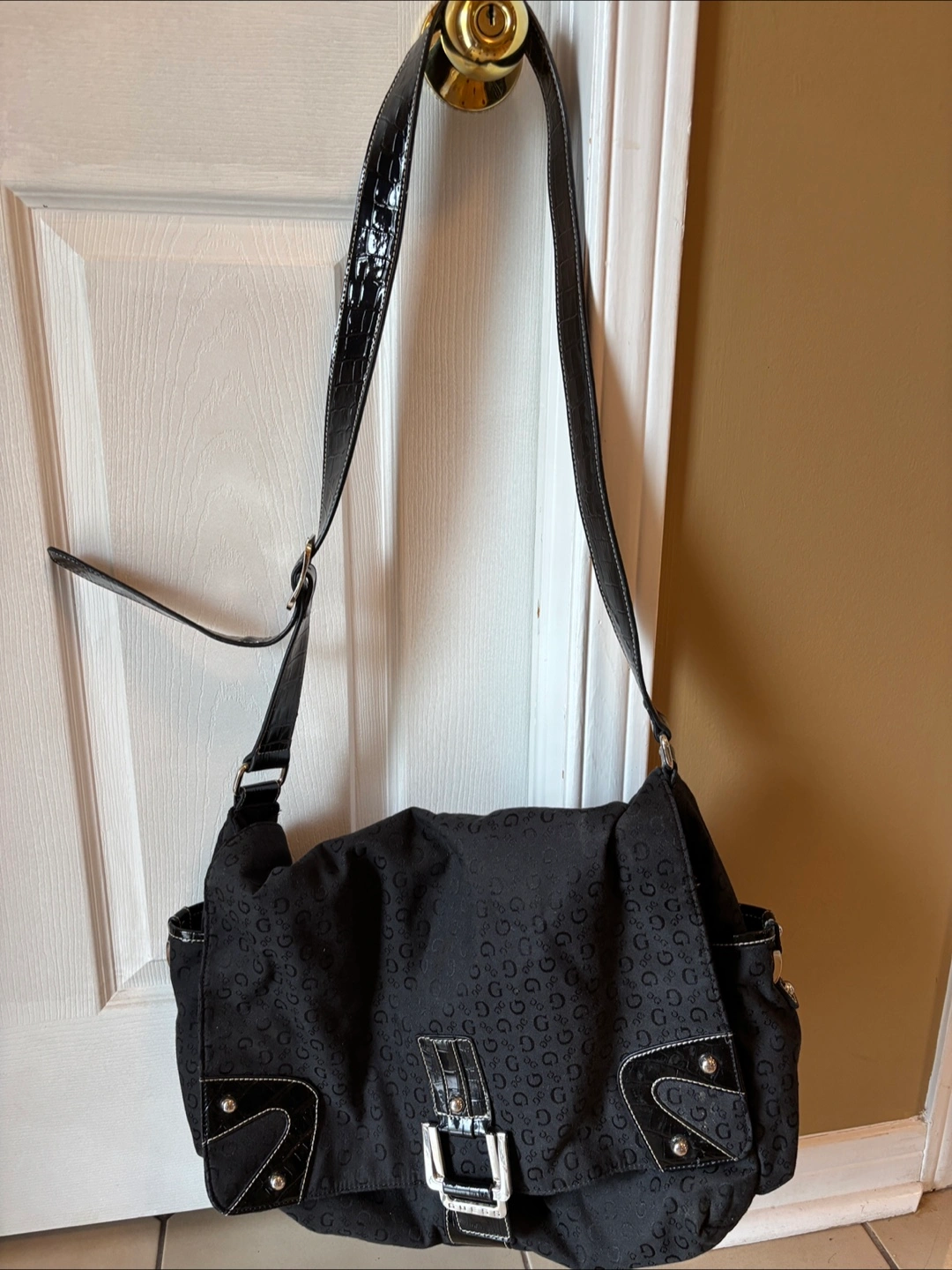 Black shoulder bag with a patterned texture. Features a clasp closure with silver-tone hardware. Exterior with several pockets. A great option for carrying laptop etc.