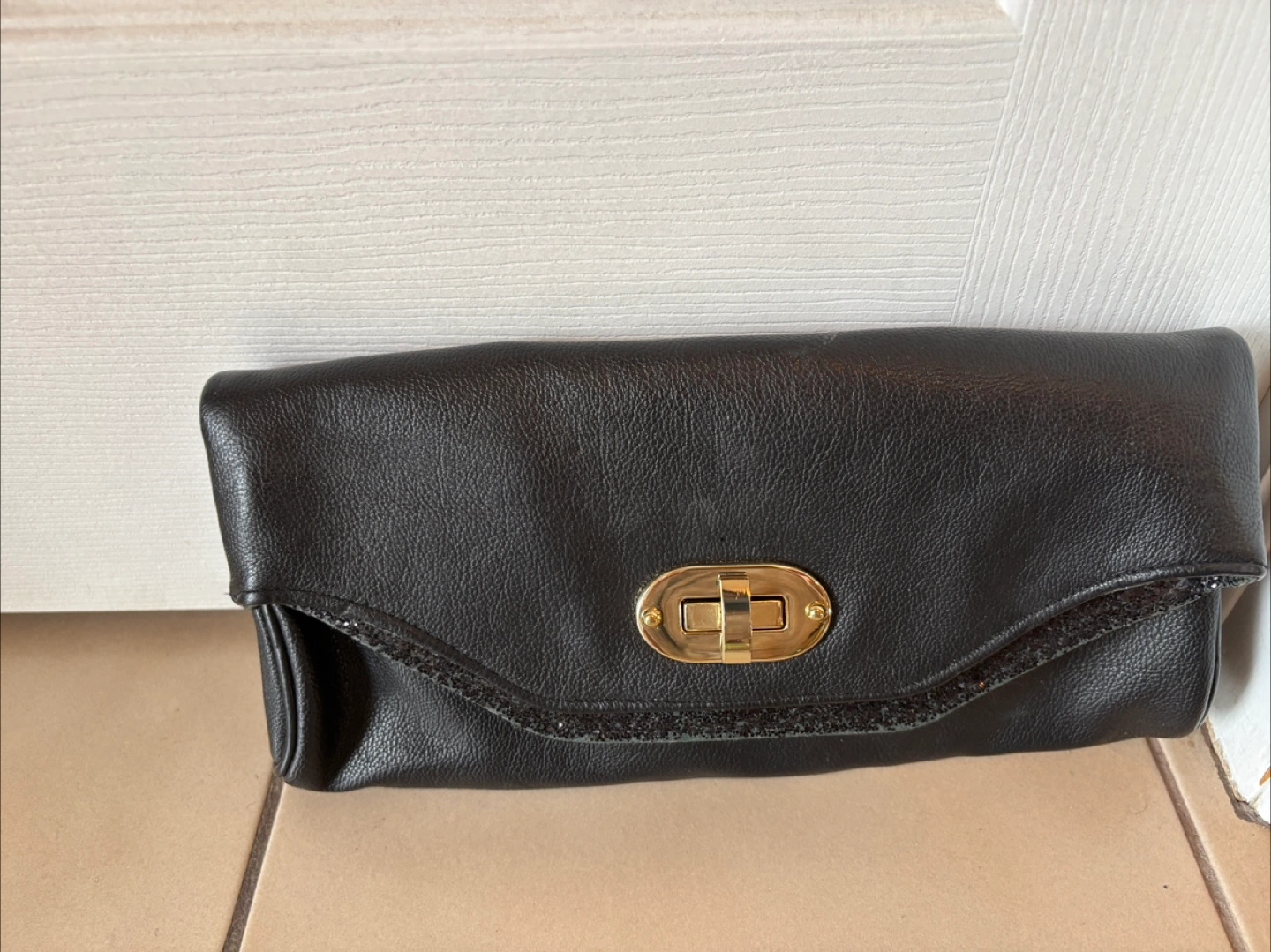 Dark colored purse. Features a flap with a gold-tone turn lock closure. The interior has a zipper pocket. The clutch is a lovely accessory for any outfit. Condition reflected in price.