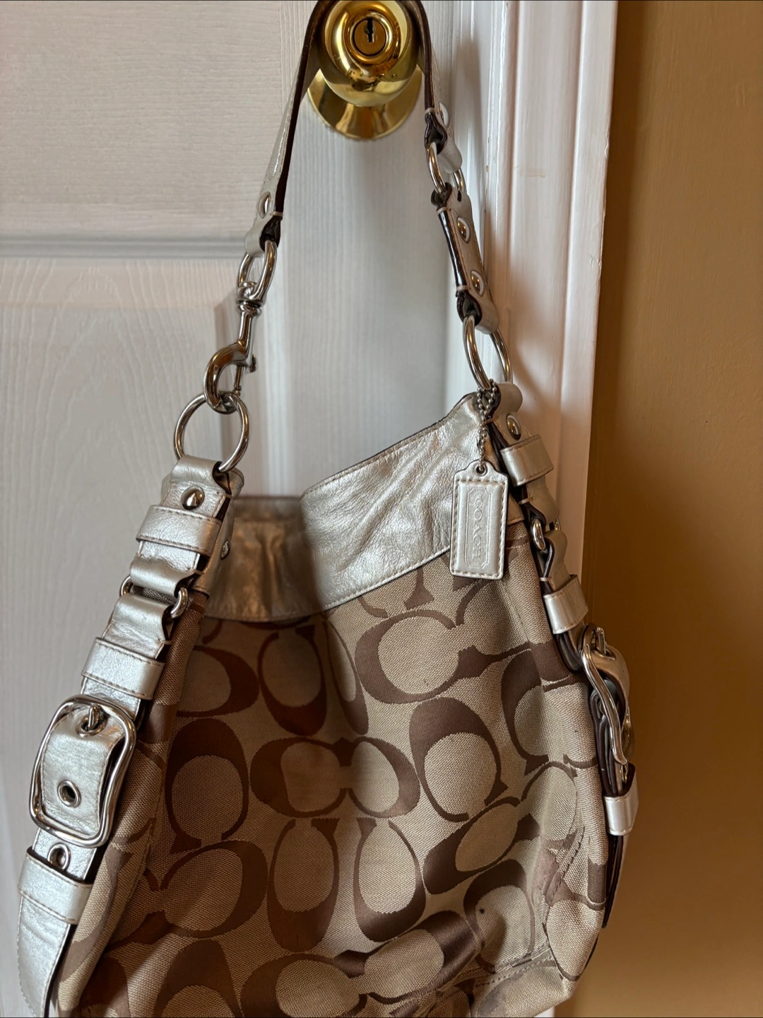 Hobo style shoulder bag. Brown monogram print. Silver-toned hardware. Buckle details. Great for daily use, carrying your essentials in style. Authentic