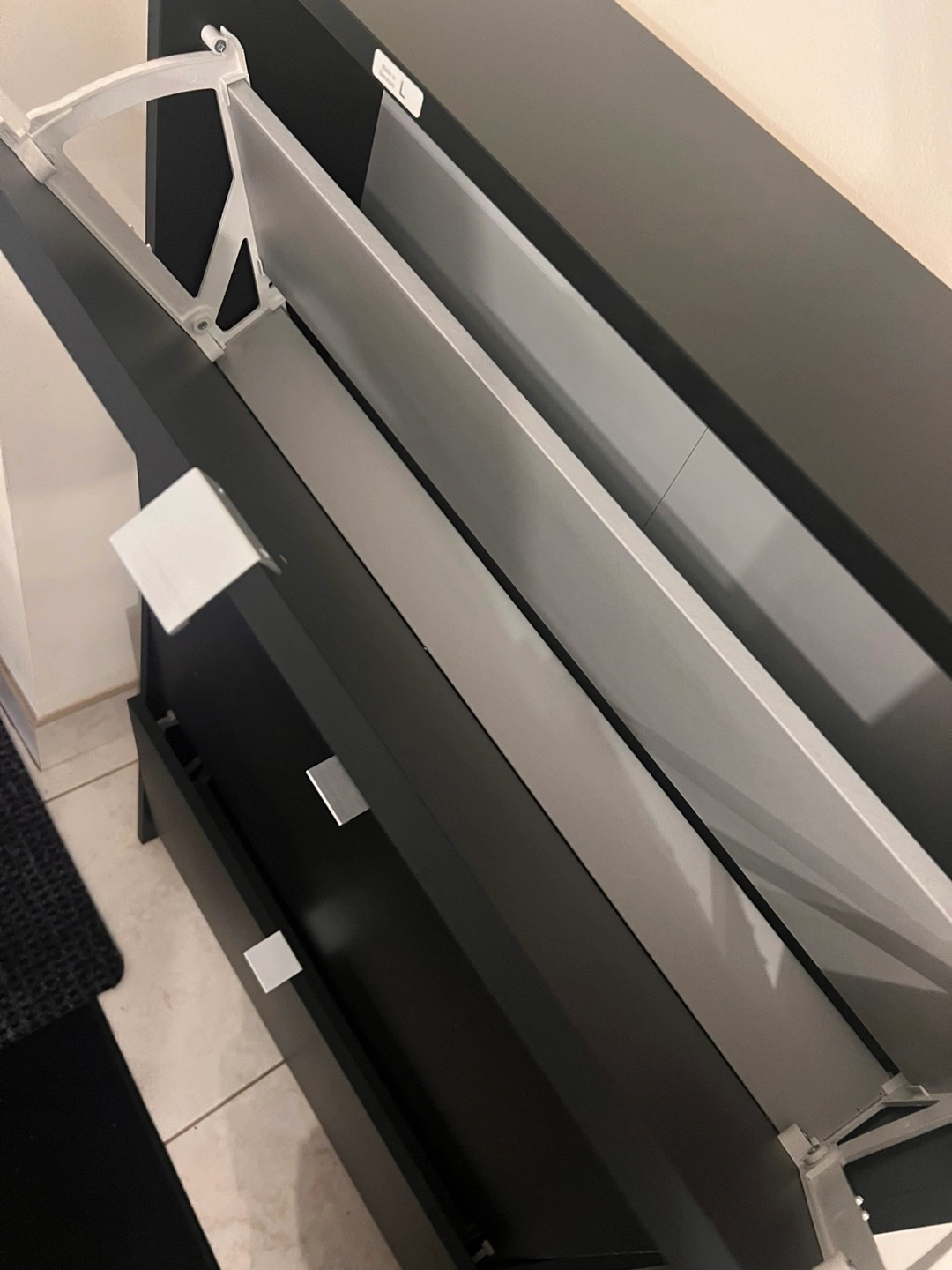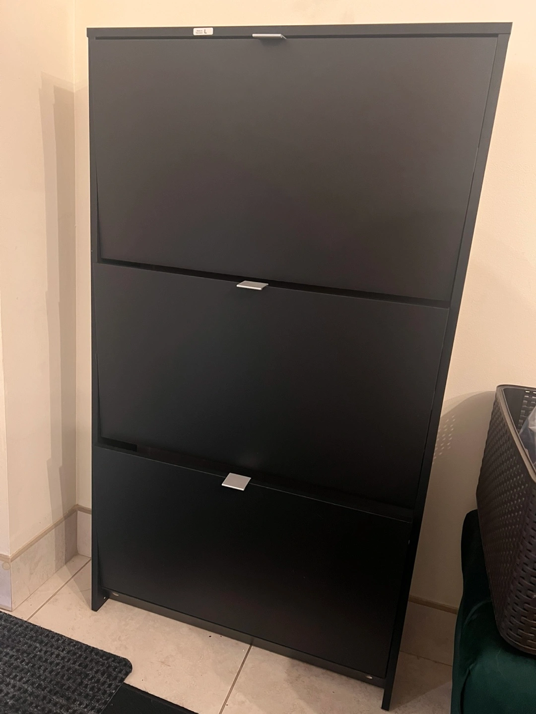 A black shoe cabinet. Features three compartments, each with a drop-down door. Could be a useful addition to an entryway or closet for some organization.