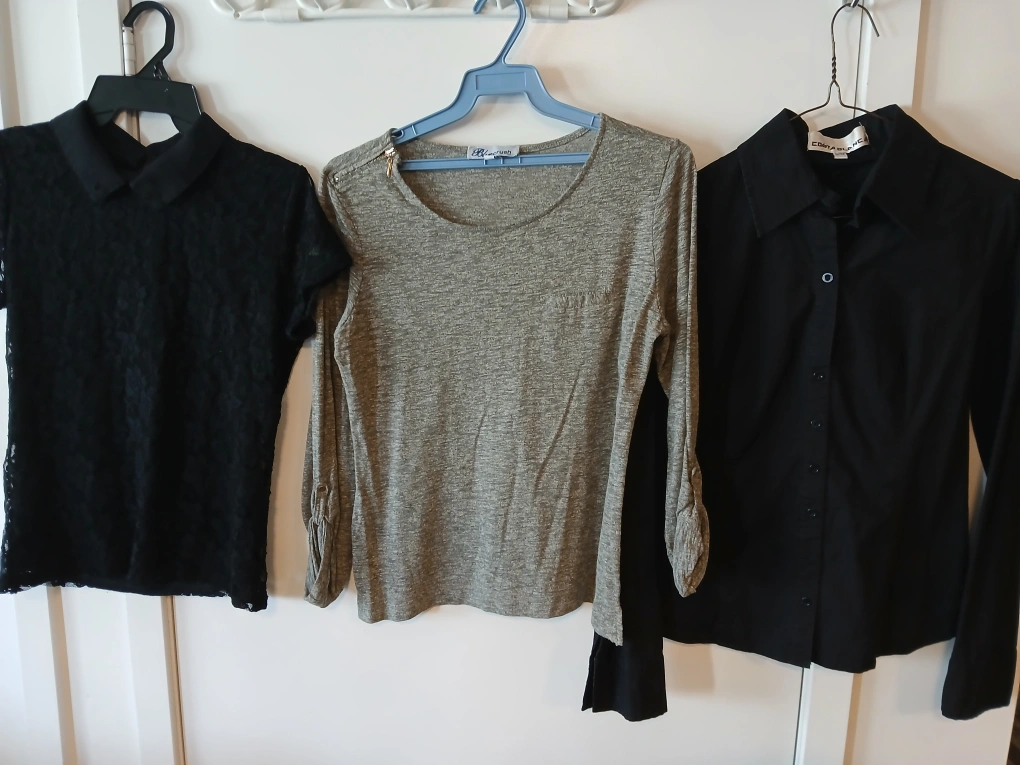 All tops in excellent condition. 1.Ardenes Top is Black lace over black material. 2. BlueCrush Grey Top. 3. Costa Blanca long sleeves Top. Cute and fashionable. Sf/pf home.