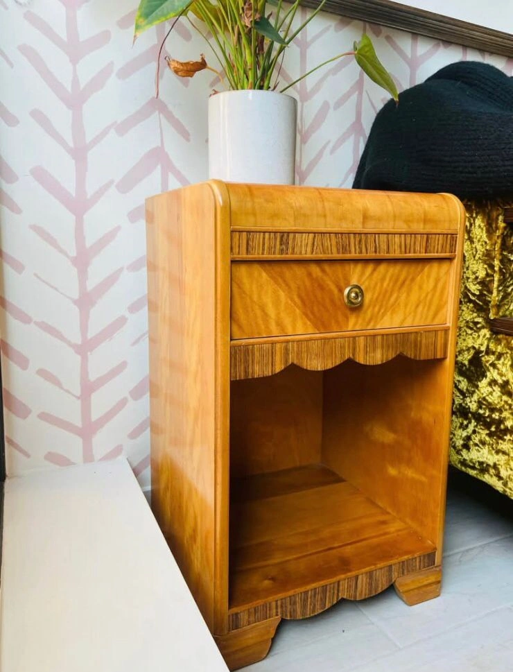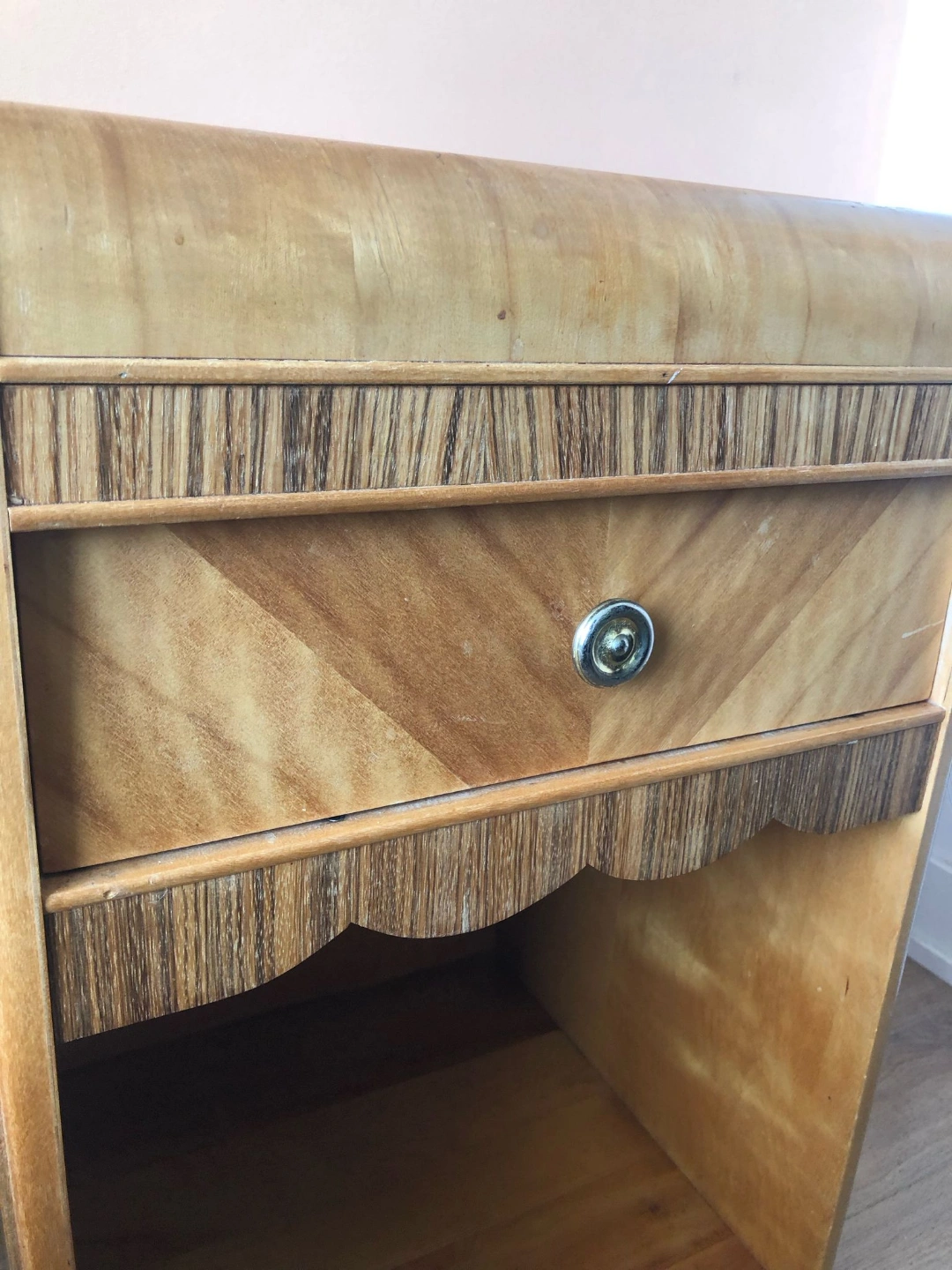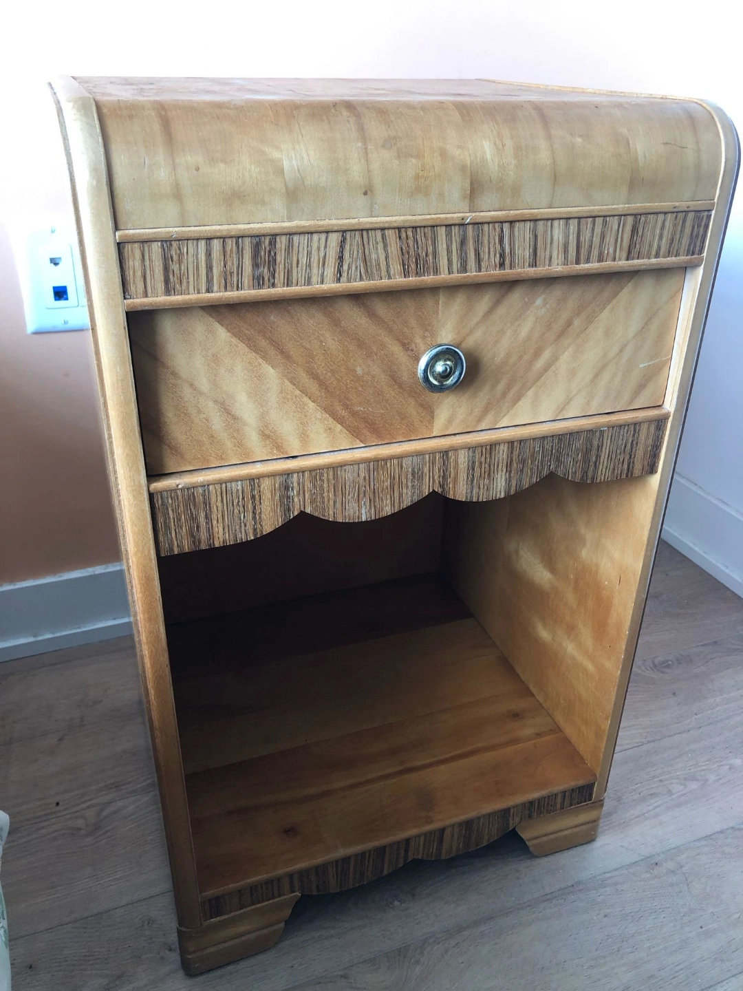 Vintage 1940s side table with waterfall edge and pretty scalloped detail. Some refinishing needed on top.