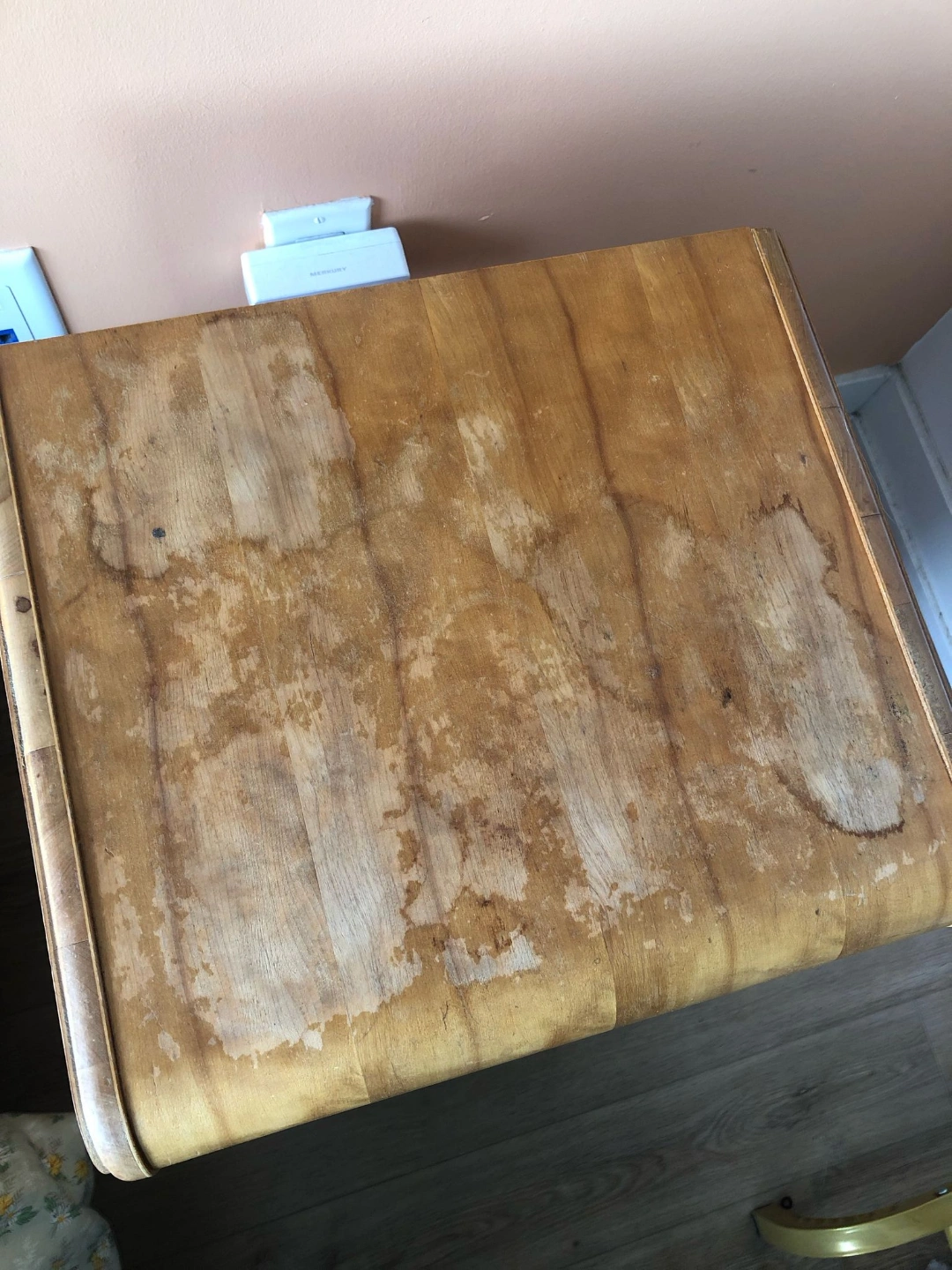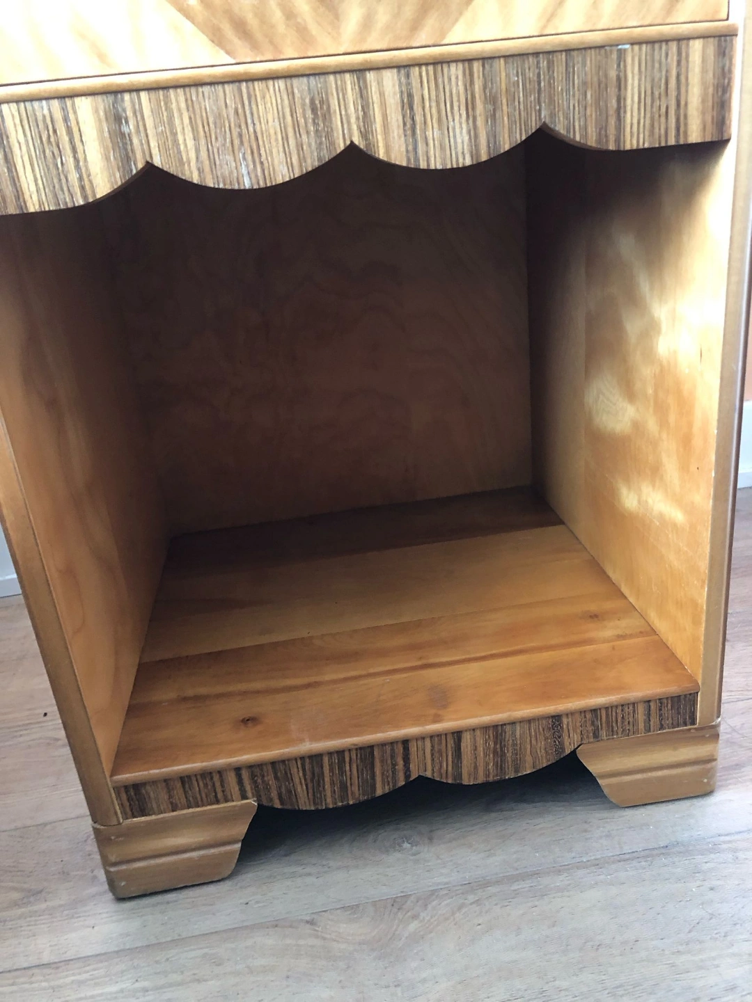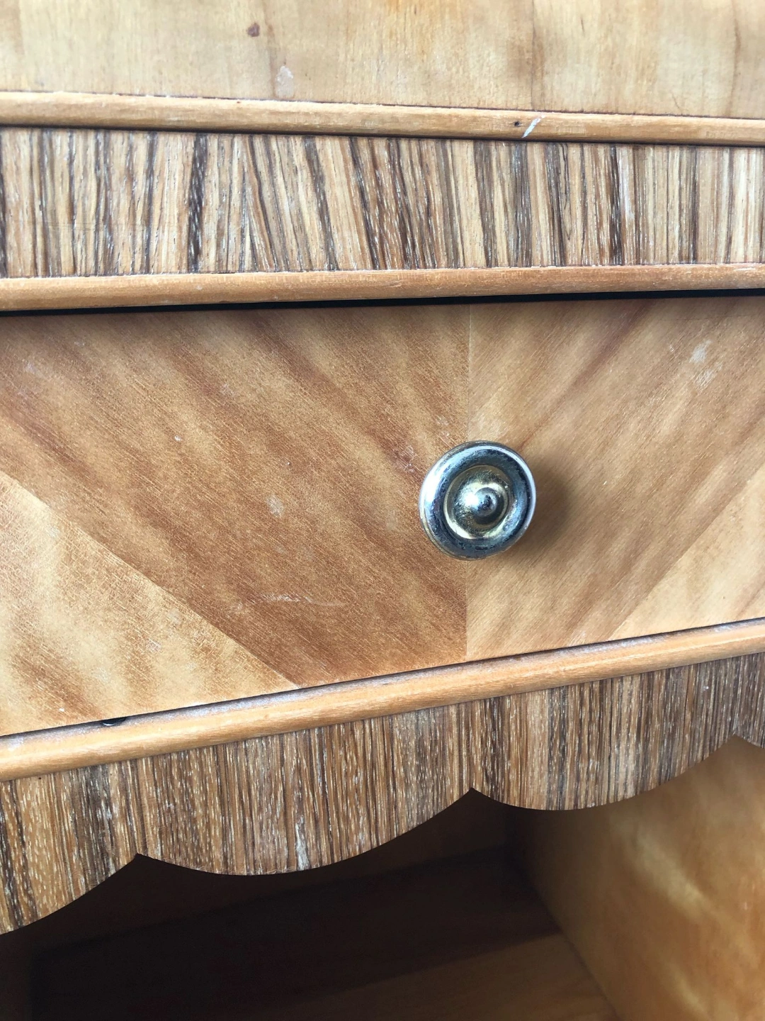 Vintage 1940s side table with waterfall edge and pretty scalloped detail. Some refinishing needed on top.