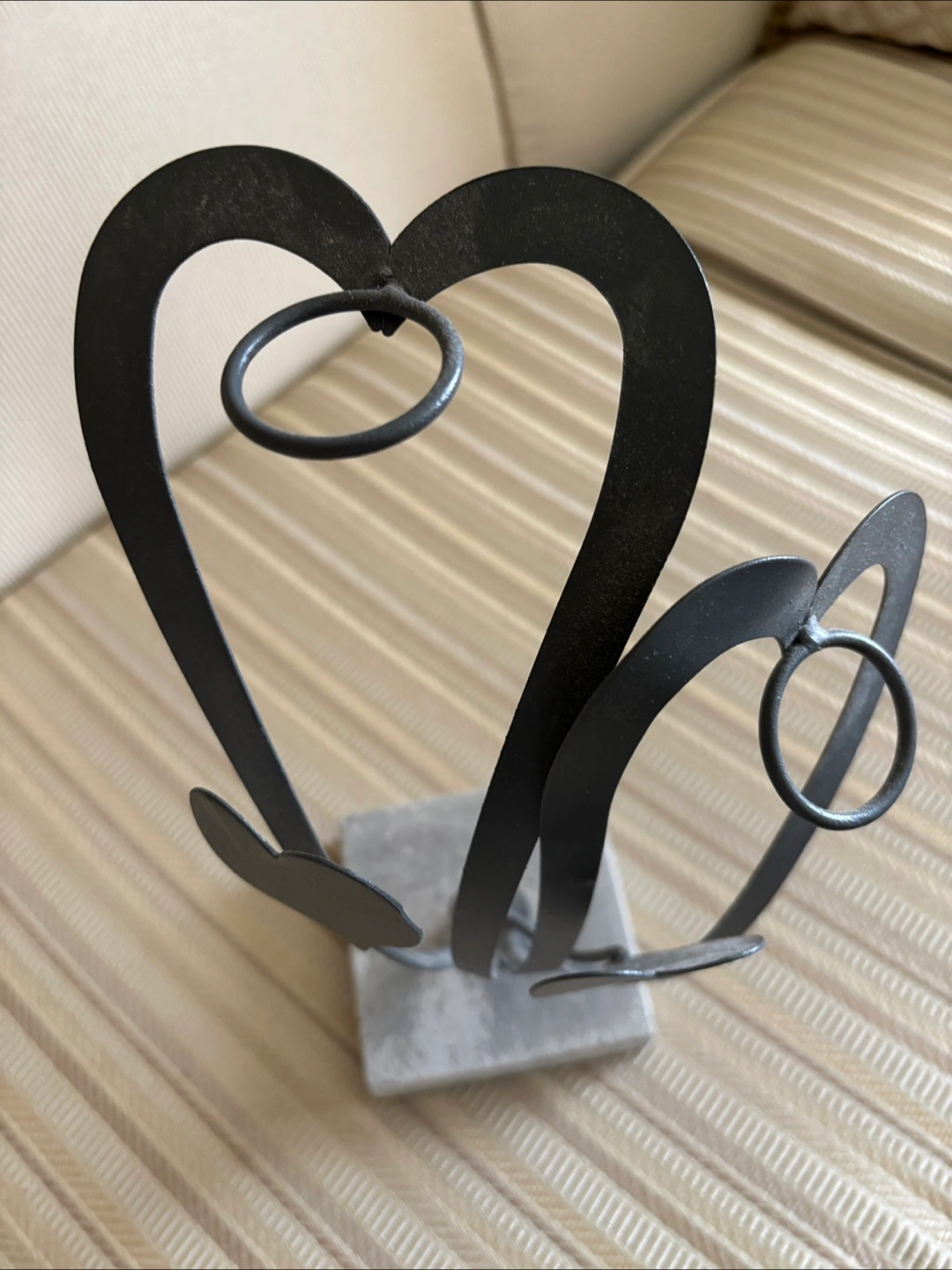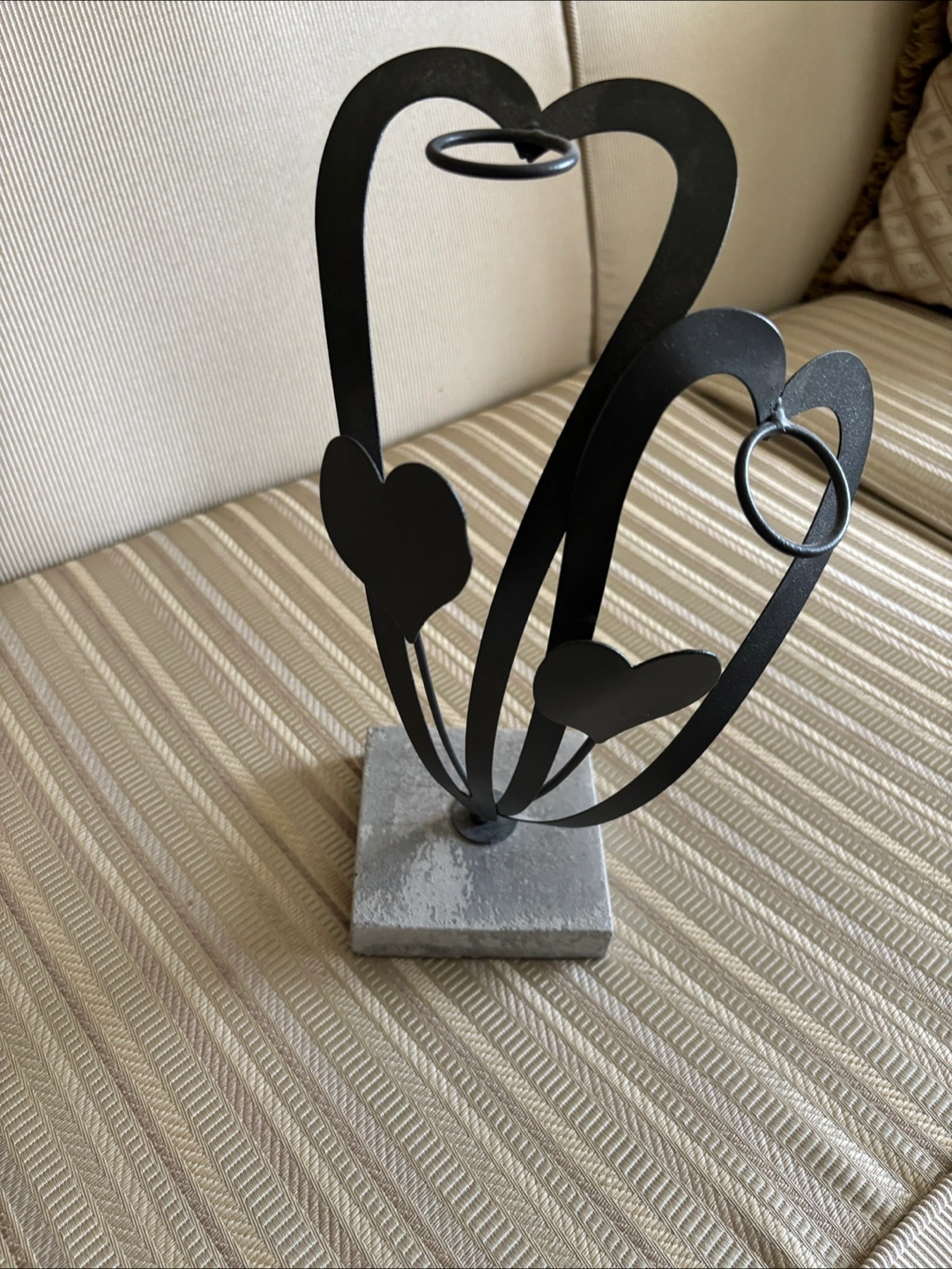 Black metal heart sculpture. Features a stone base. The rings are perfect for holding something small. Place this sculpture in your favourite space, and find your peace. Approximately 11inches height