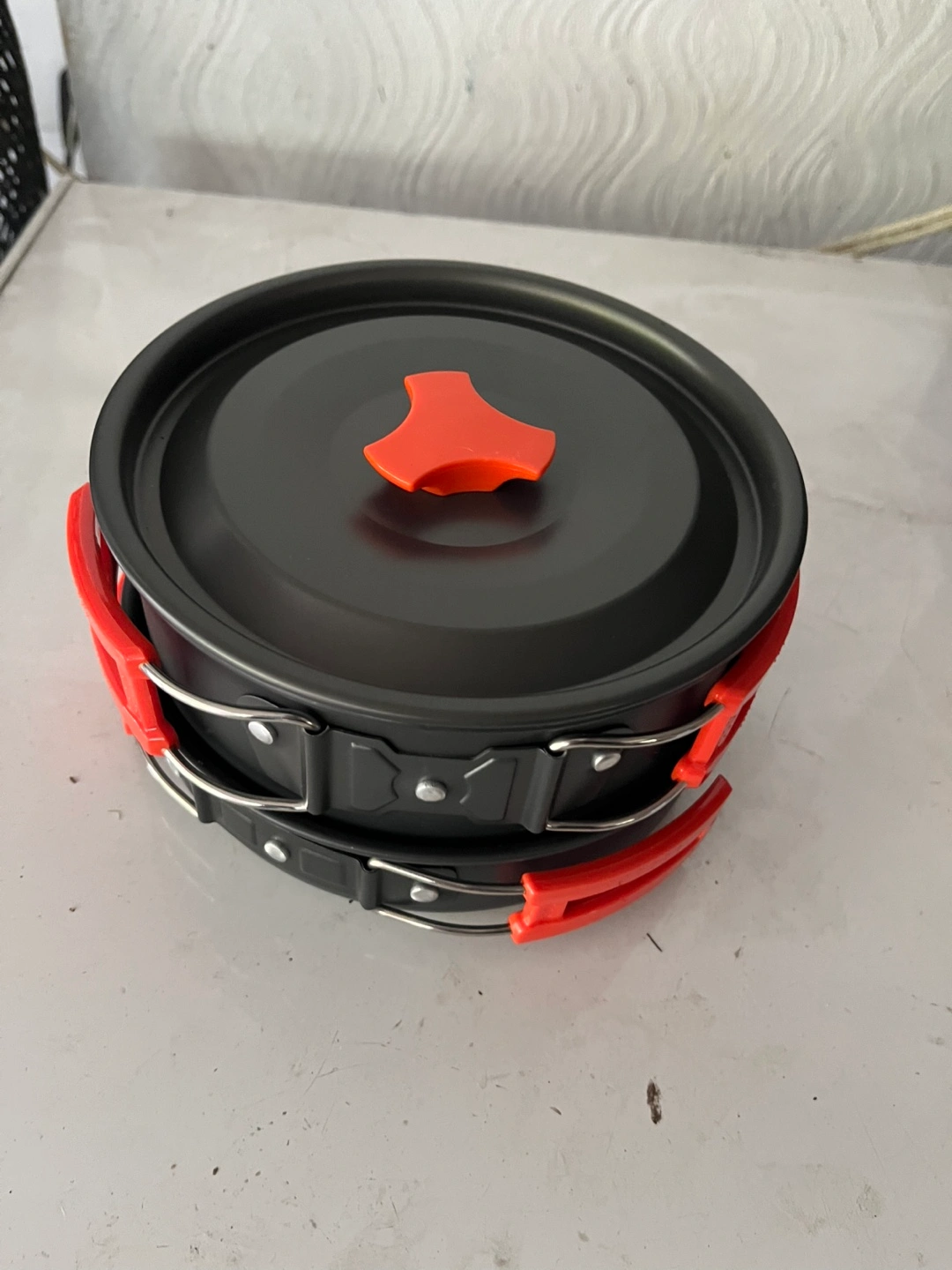 Set of camping cookware pan pot and kettle. Unused. Includes a pot a pan and kettle that nest together. Great for making a warm meal out in the wilderness. Lightweight