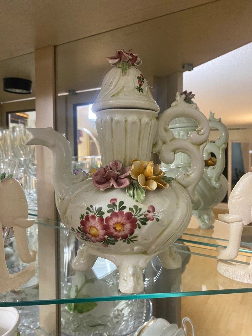 Beautiful floral design with 3D flowers. The teapot is made of porcelain and has a lid. The teapot is about 9 inches tall. It is signed on the bottom.