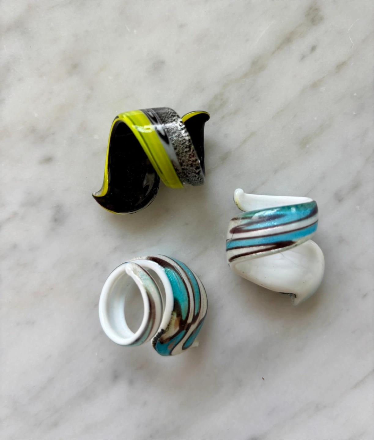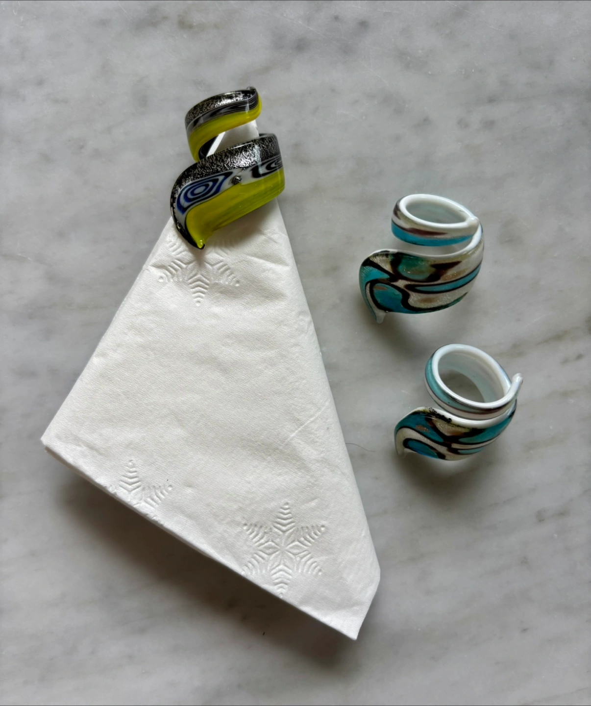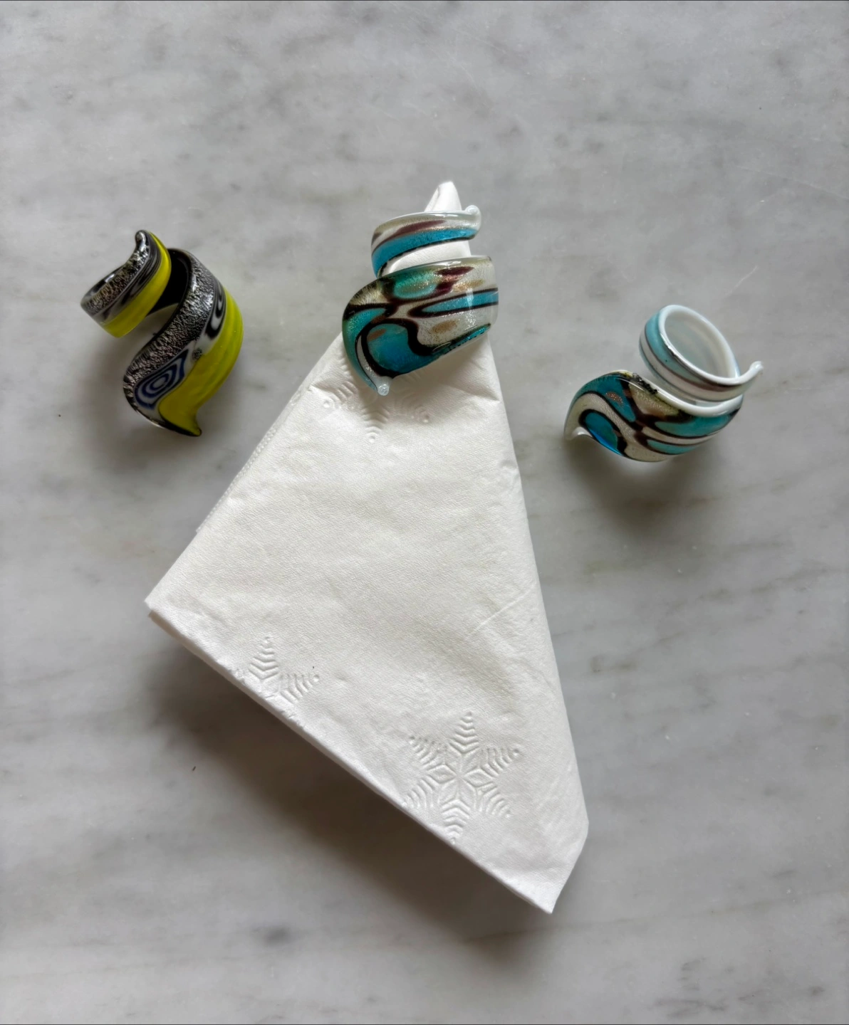 Three spiral napkin rings. Made of a colourful glass material. Can bring elegance to any tablescape. A storage box is included.