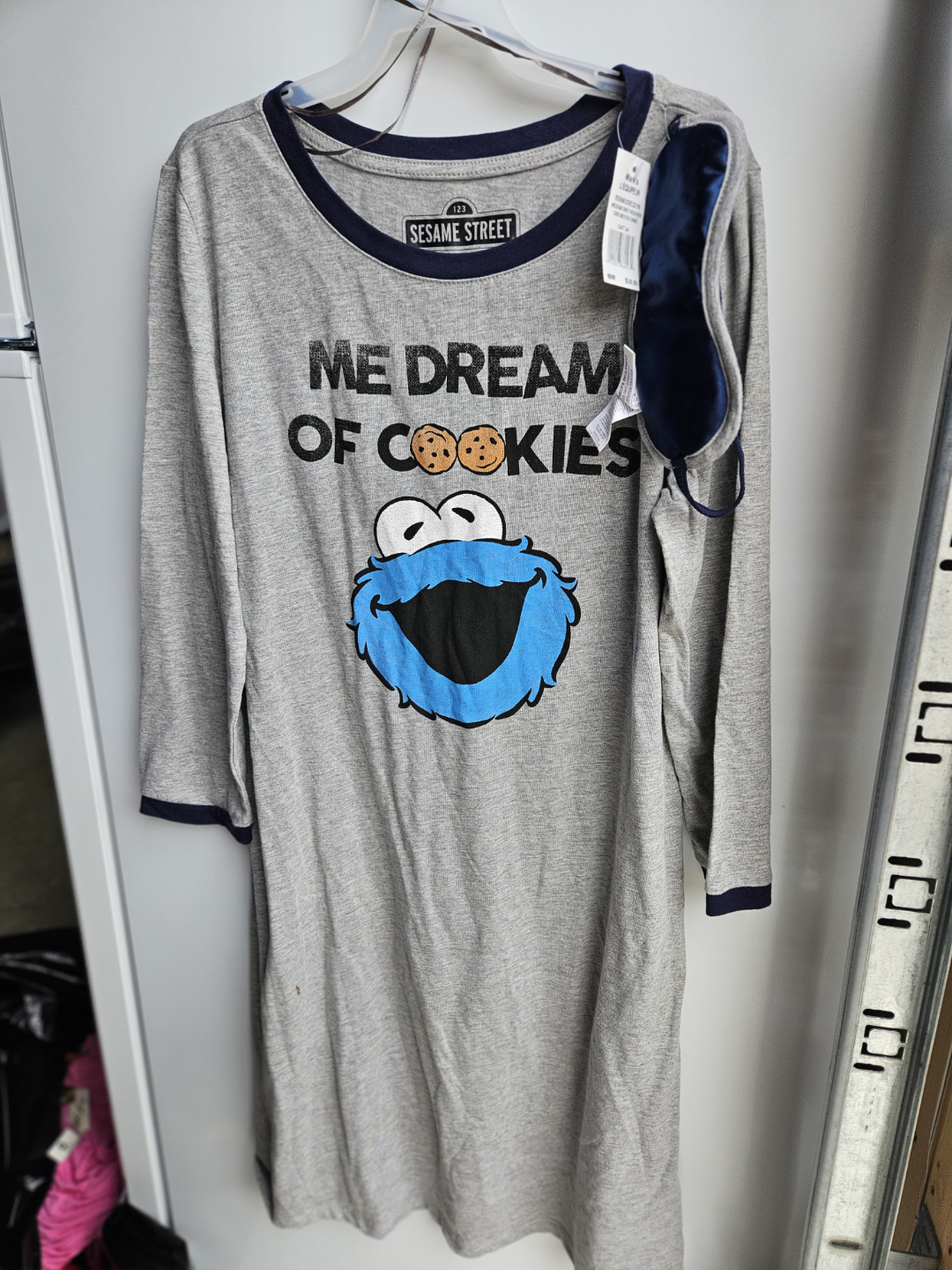 Grey nightgown featuring Cookie Monster. Long sleeves with navy trim. Comes with a sleep mask. Wearing this will help bring sweet dreams.