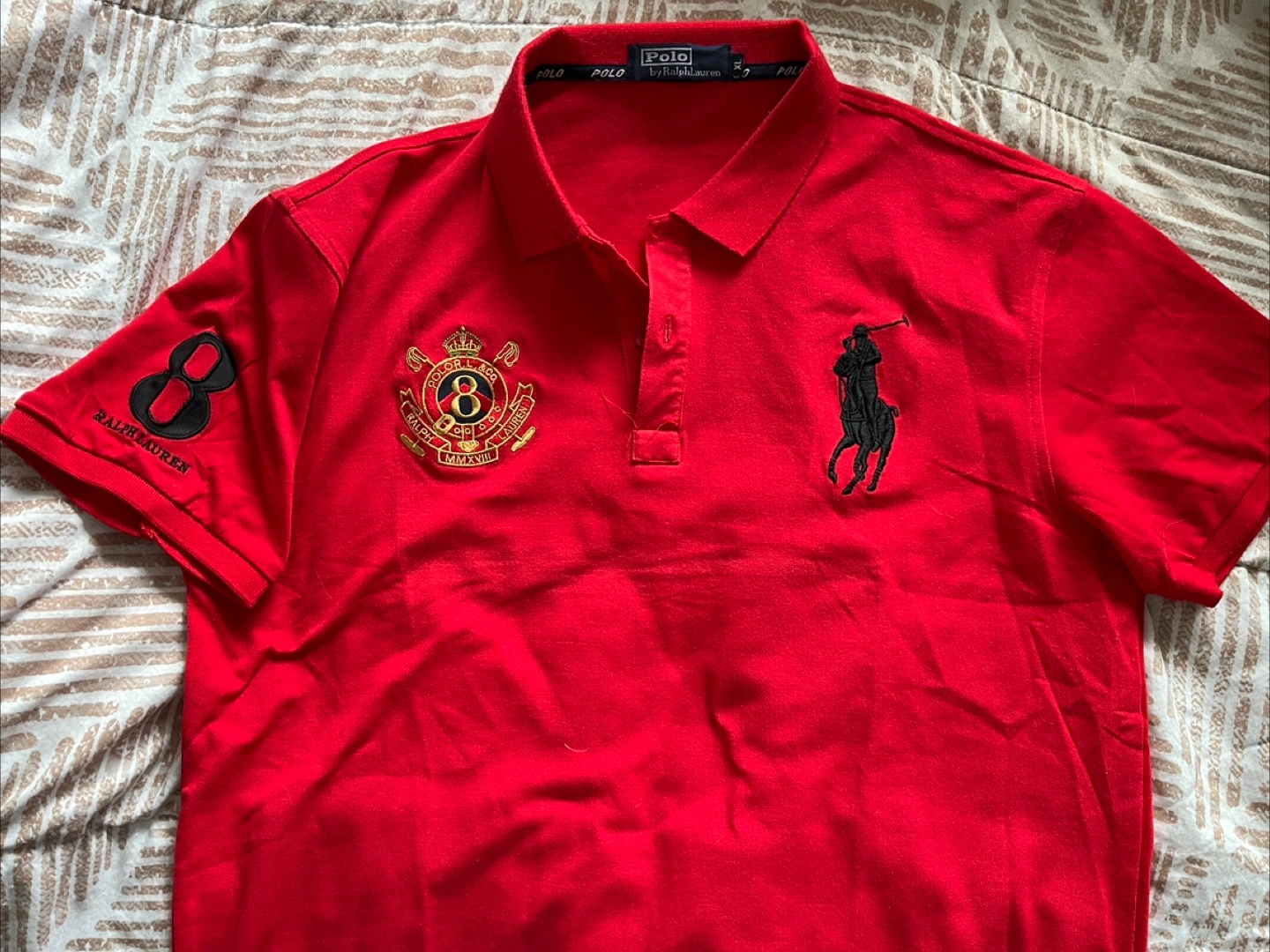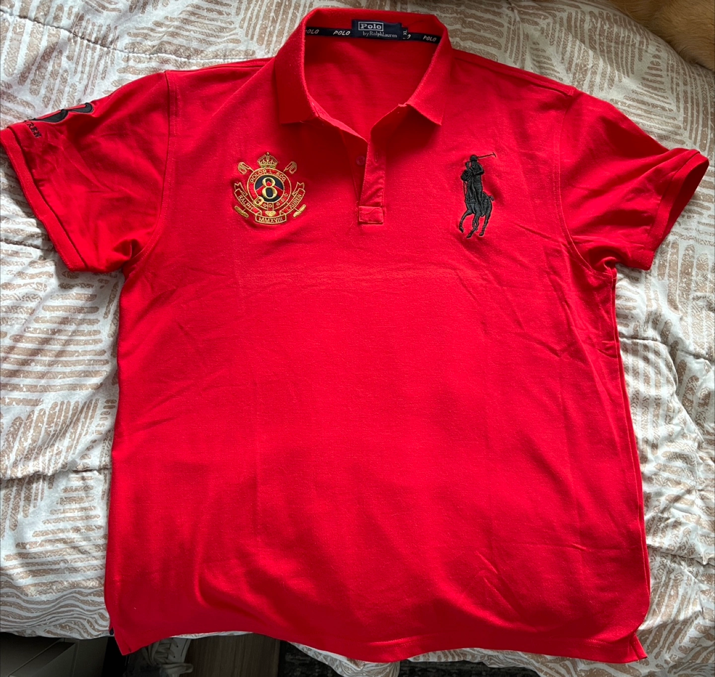 Bright red polo shirt. Features a collar and short sleeves. Embellished with a logo on the chest and sleeve. Perfect for a casual day out with friends.