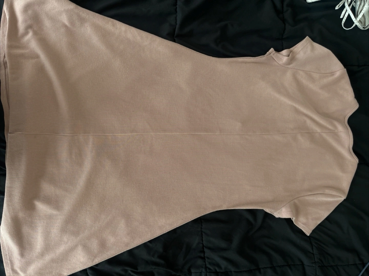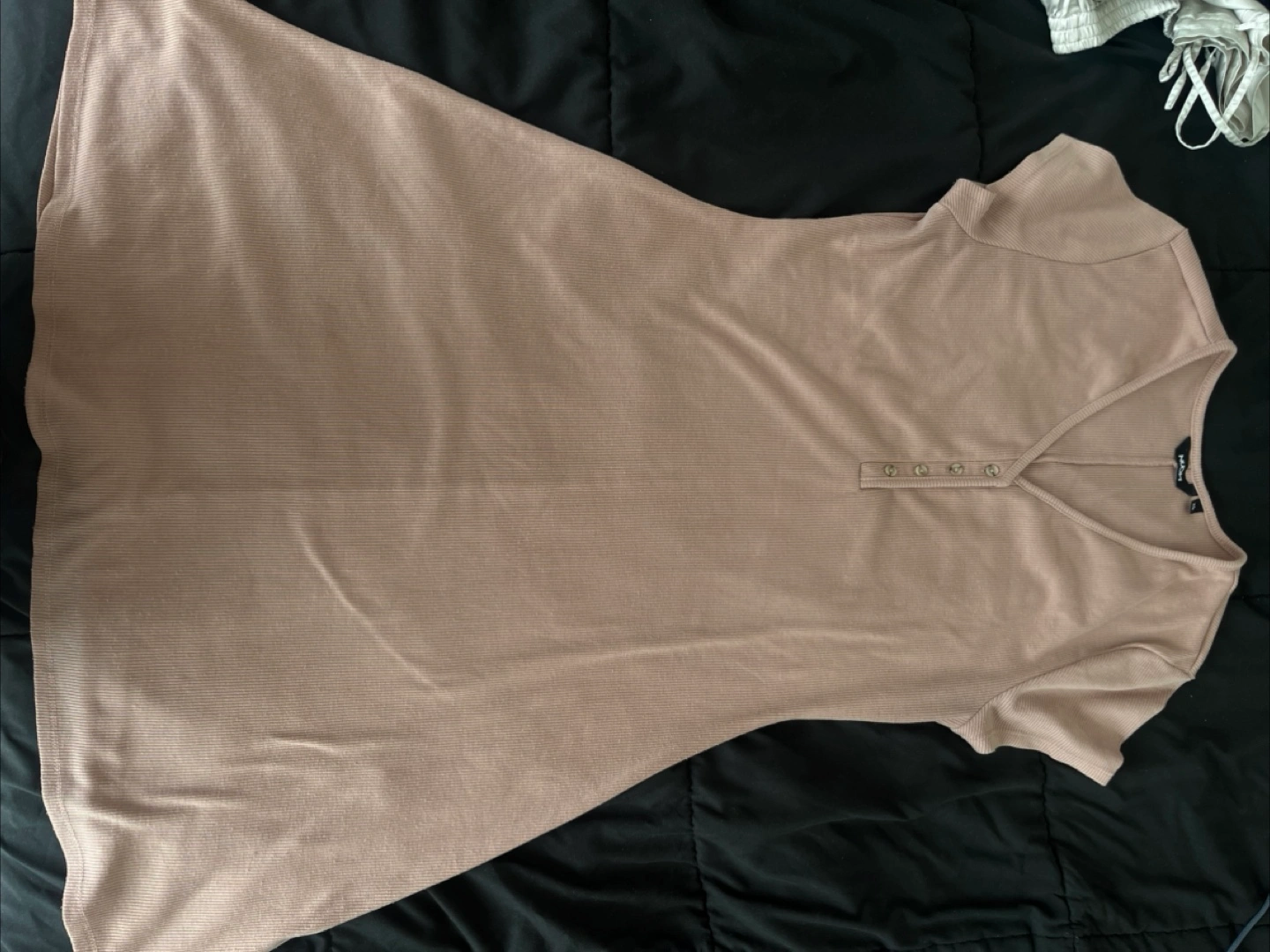 A light-coloured dress. Made of a ribbed material. With a v-neck. A button-up closure. It could be a great addition to your wardrobe and create a stylish outfit for any occasion. Extremely versatile and stylish.
