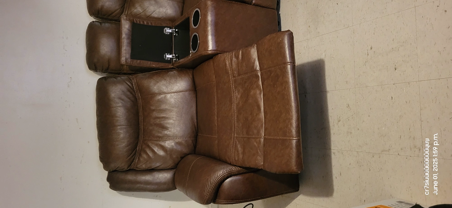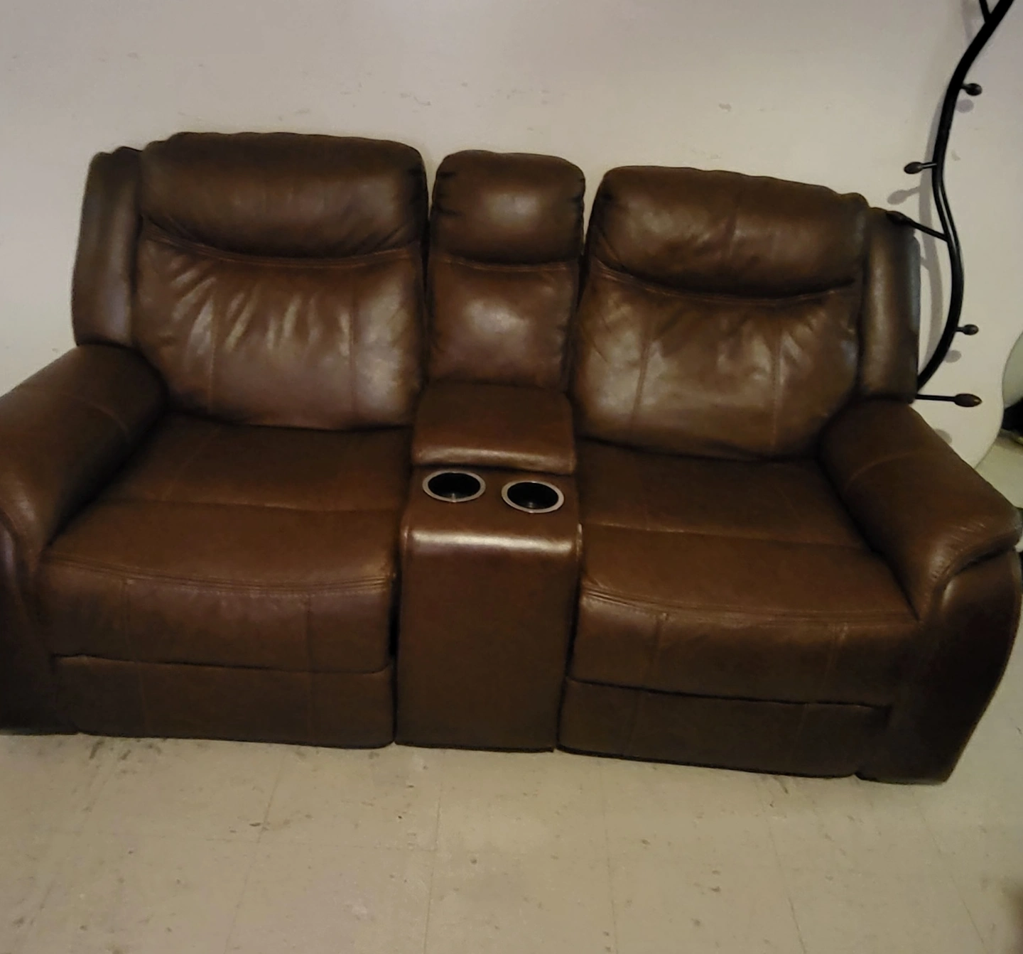 Sofa with two reclining seats. Cushioned armrests. Central console with cup holders. A great place to relax after a long day.one side of the sofa doesn't work