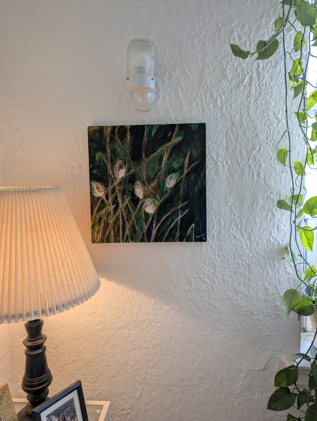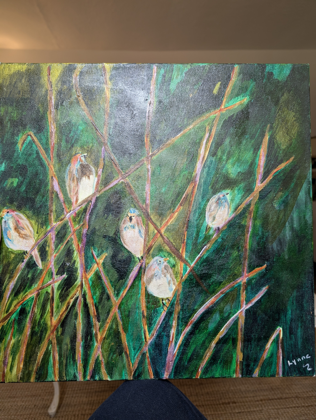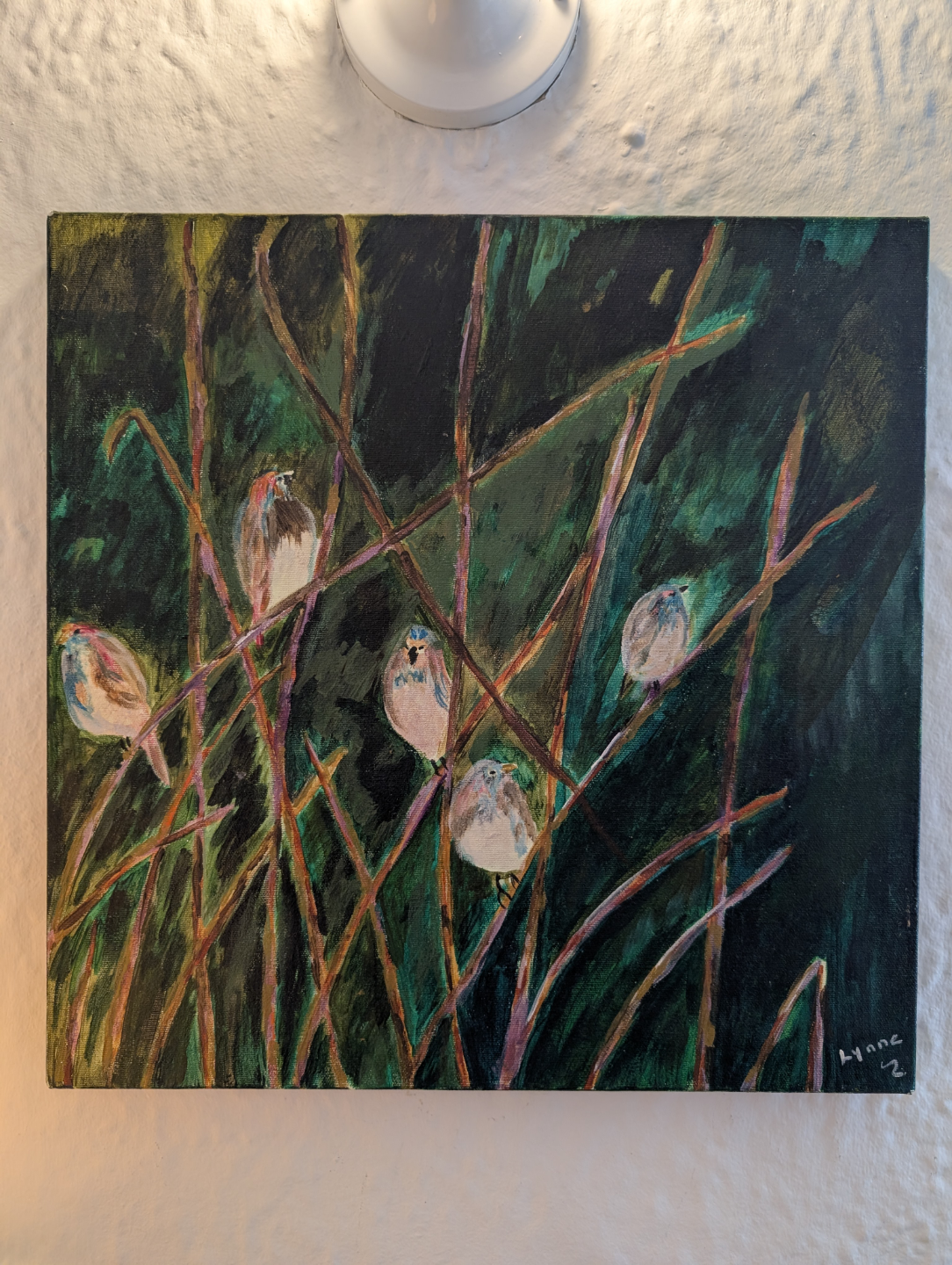 Depicts birds, perched on branches. Background shows dark, deep green colors. Would make for a wonderful piece to add to your collection.