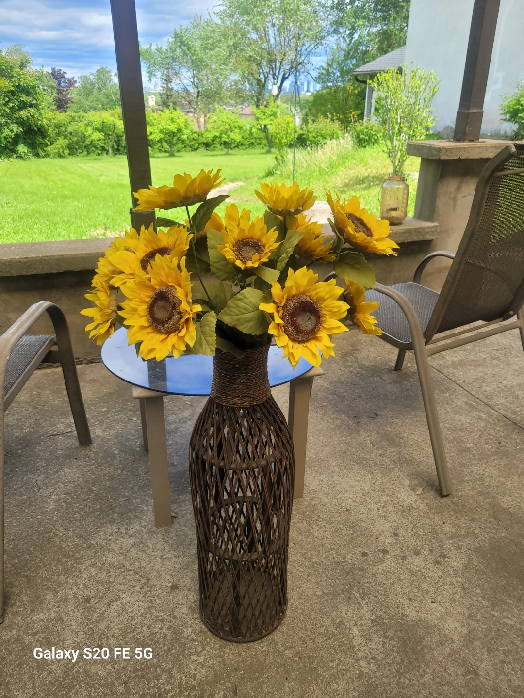 A bright sunflower arrangement. The flowers appear to be artificial. The vase is made of woven materials. A great decoration for a sunroom.