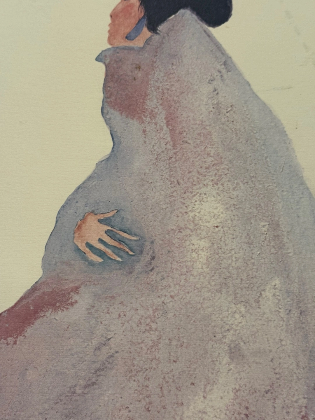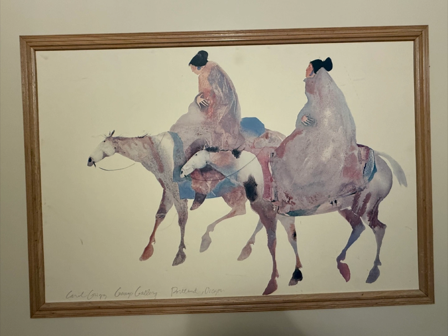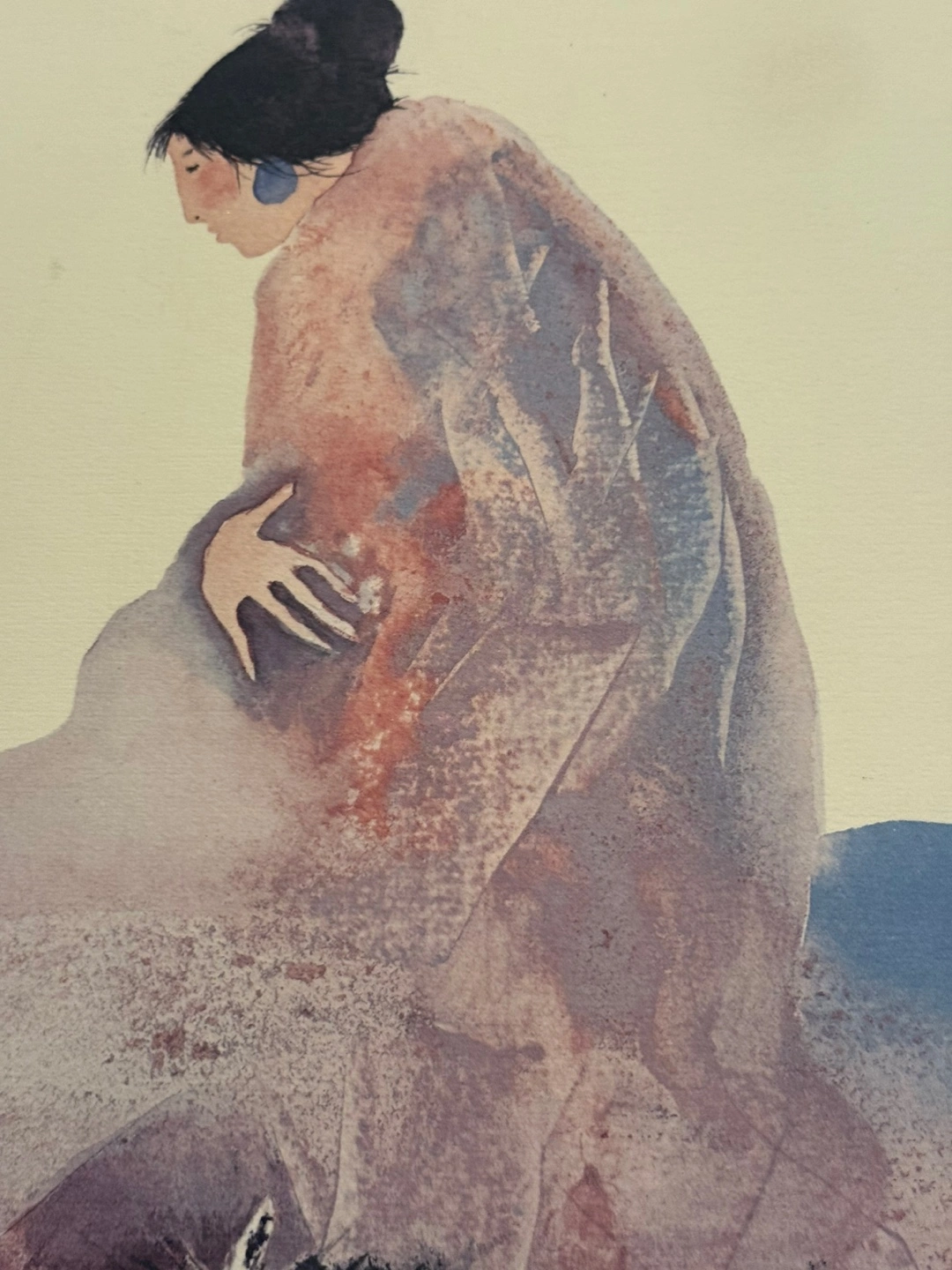 museum ‘s item A print of a watercolor painting. Depicts a woman in a cloak with horses, painted in soft colors. You can hang this to create a gentle, peaceful mood.