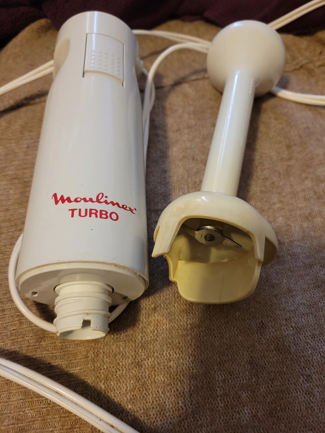 Hand blender with two detachable pieces. One piece has a white handle and the other a motor. Great for making a quick soup on a cold evening.