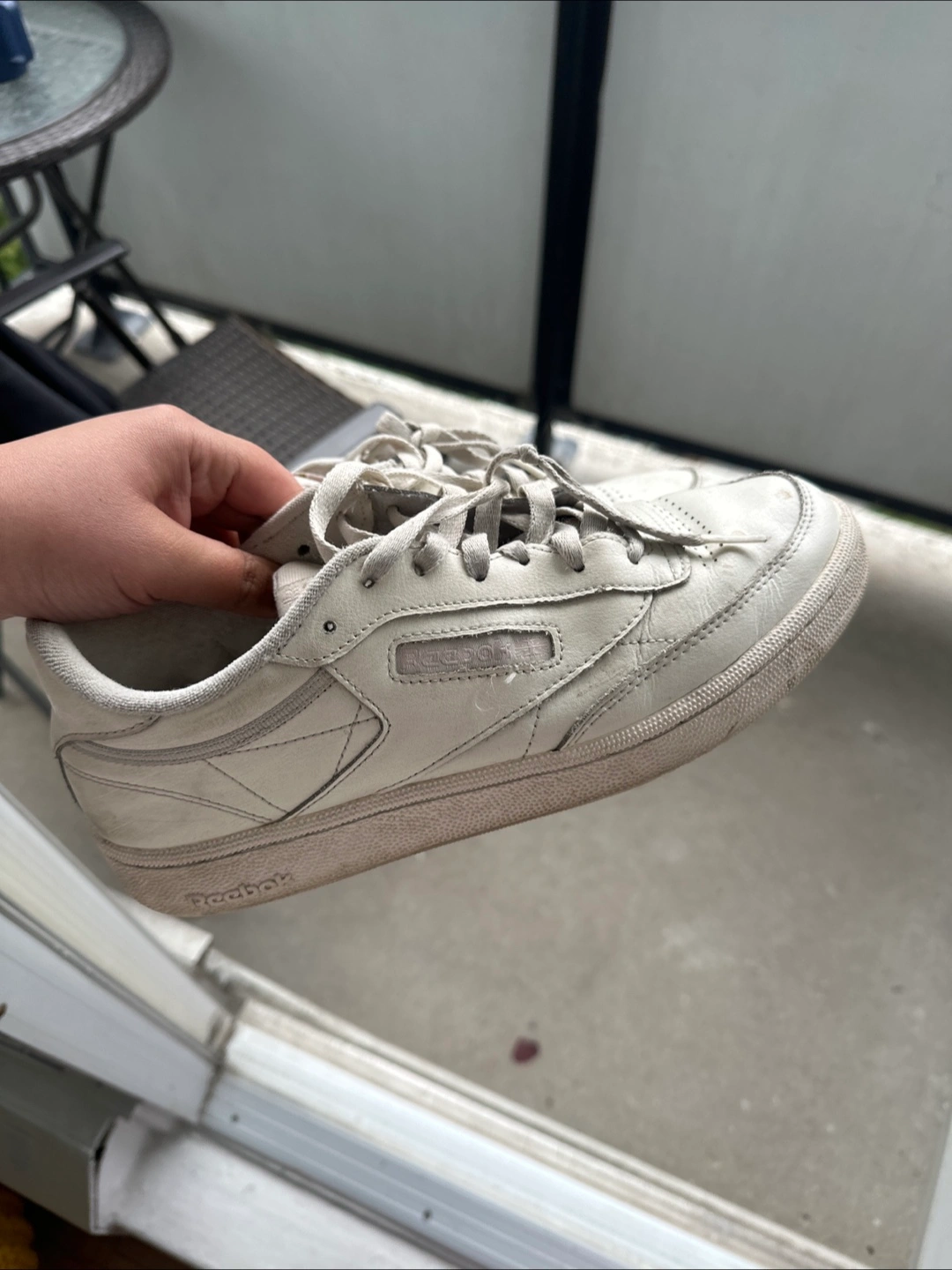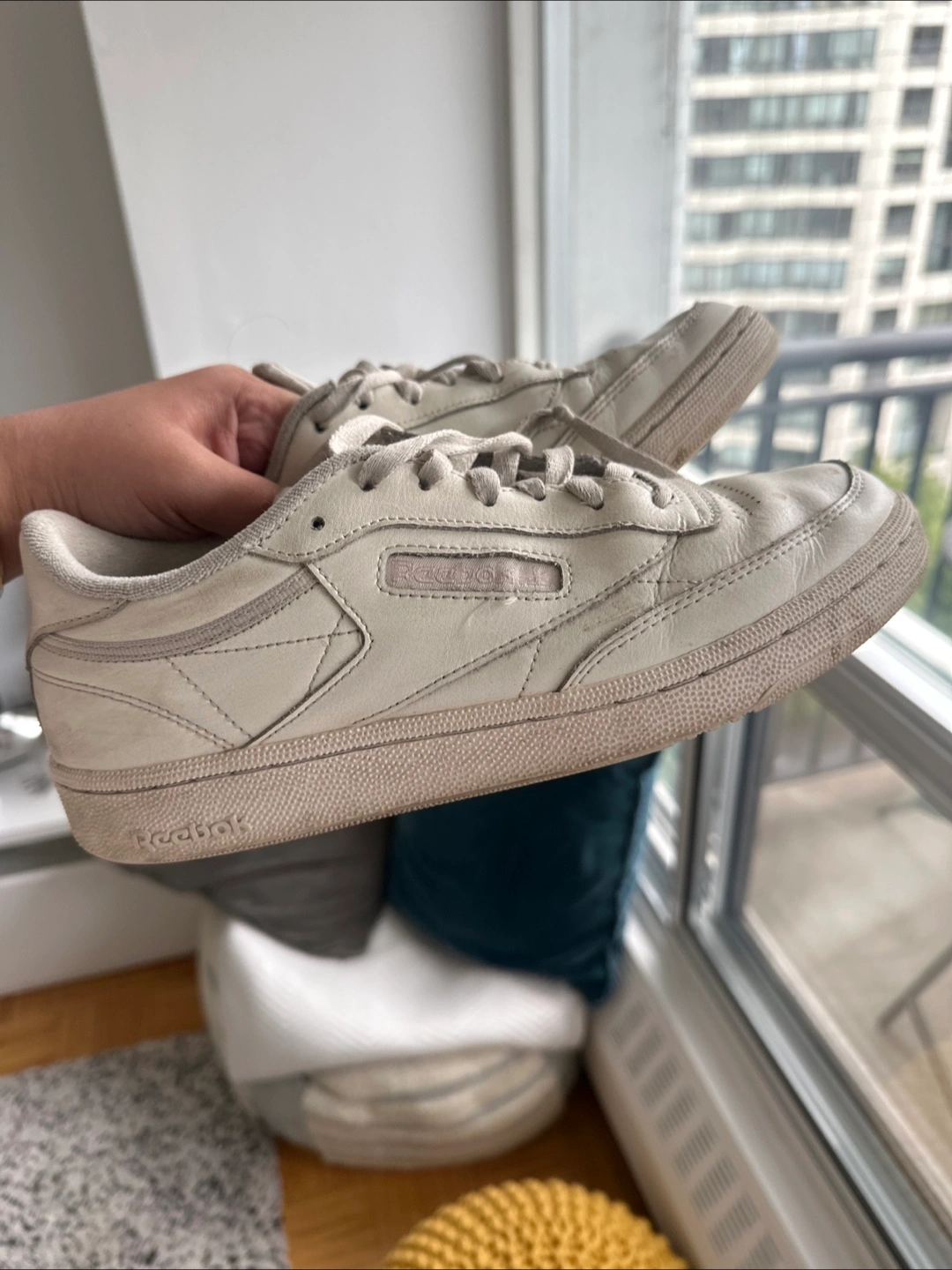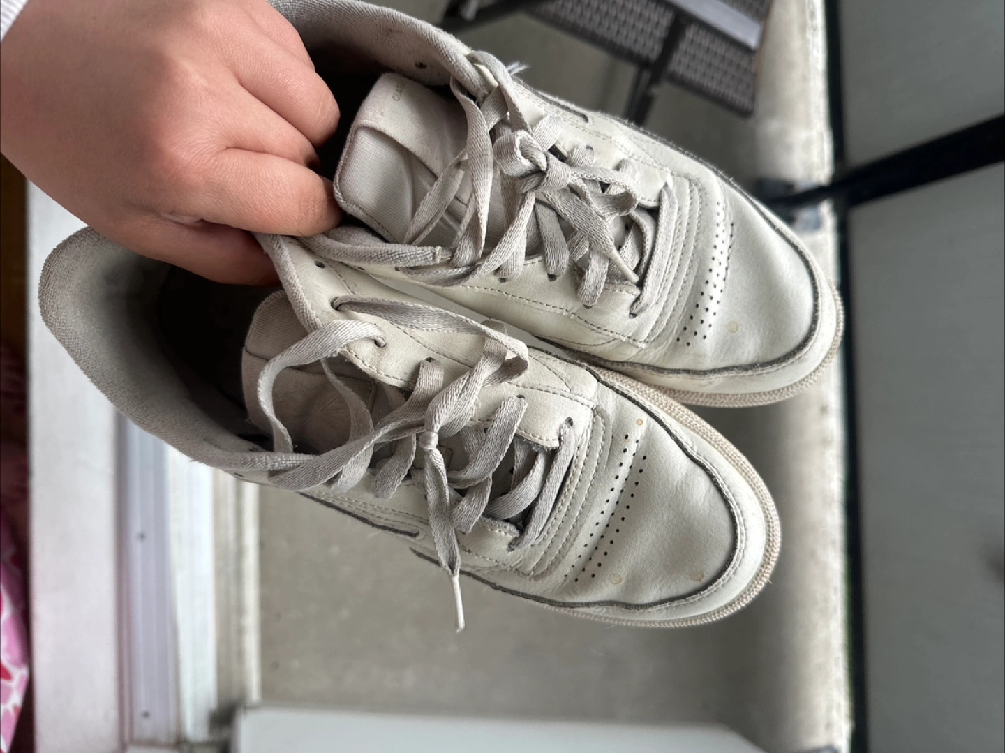Cream-coloured sneakers. Featuring laces. Show some wear. These sneakers would be great for everyday comfort and style, to ground your day in a relaxed manner.