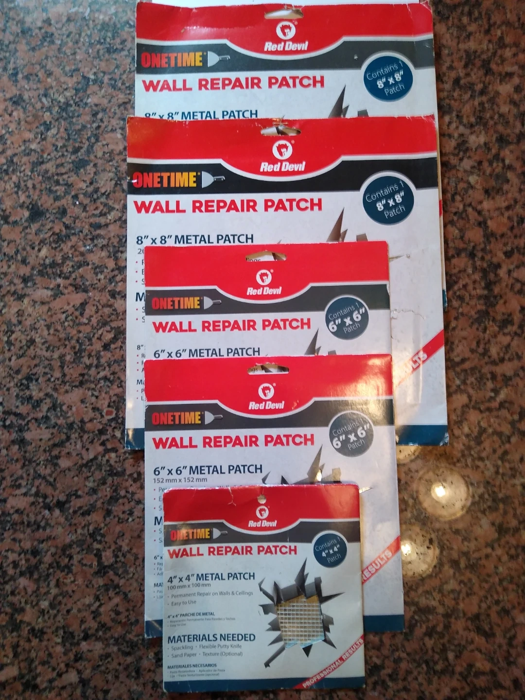 Several wall repair patches in various sizes. Easy to use for permanent repairs on walls and ceilings. Such an item can offer peace of mind. (Unopened, sealed , Never used Mint condition) 5 Patches (Qty-2 8x8), (Qty-2 6x6), (Qty-1 4x4).
