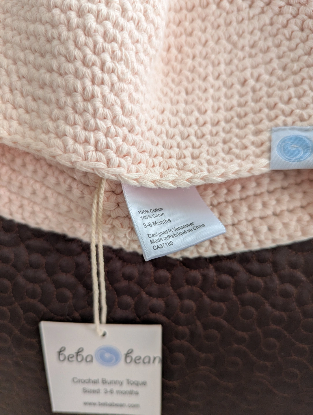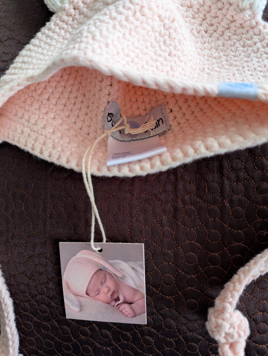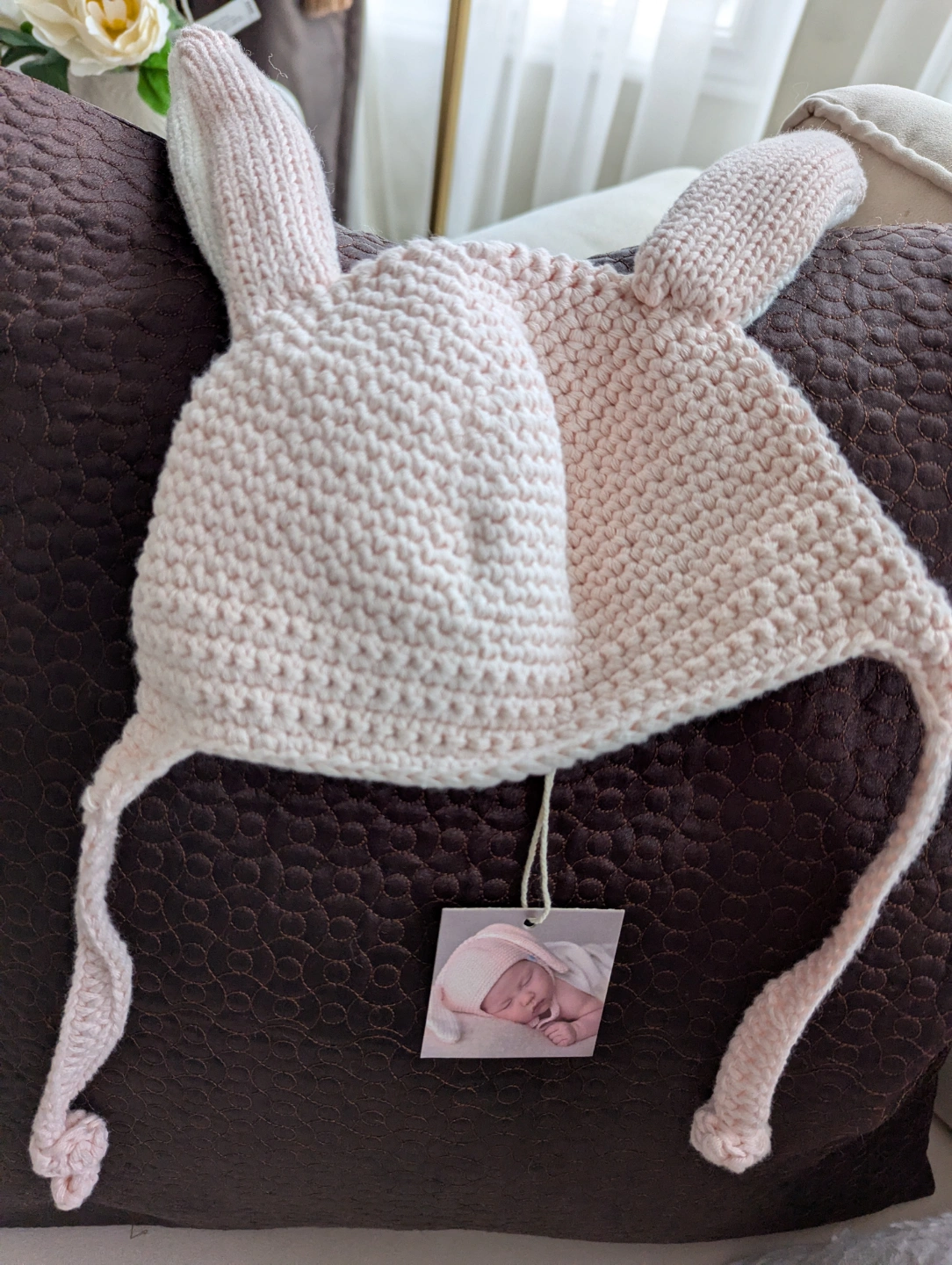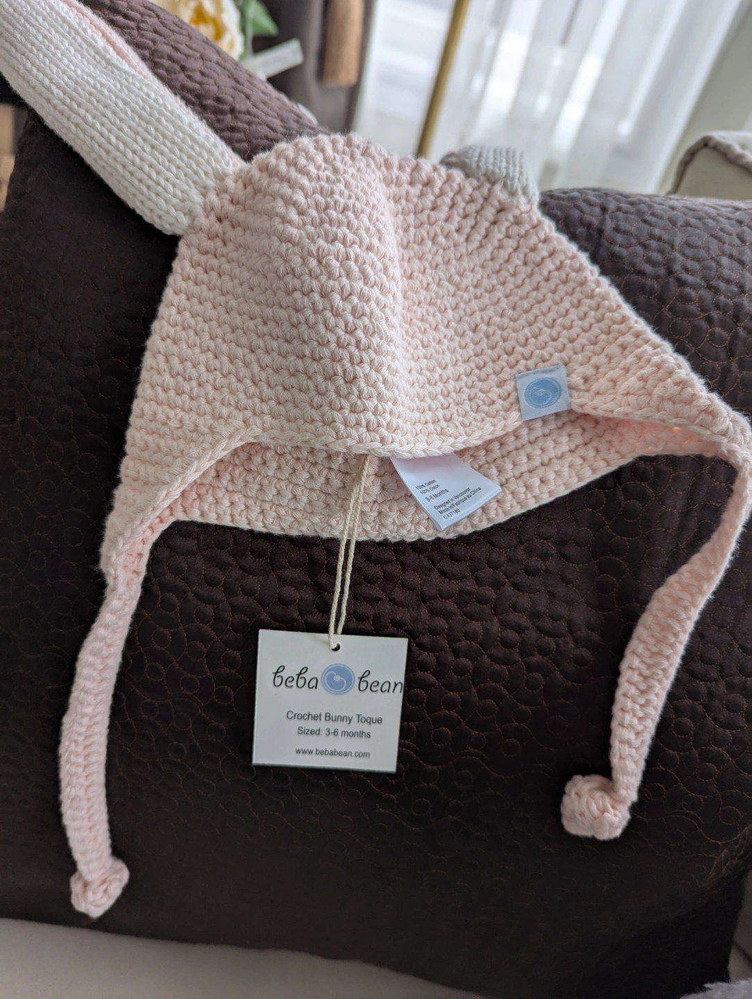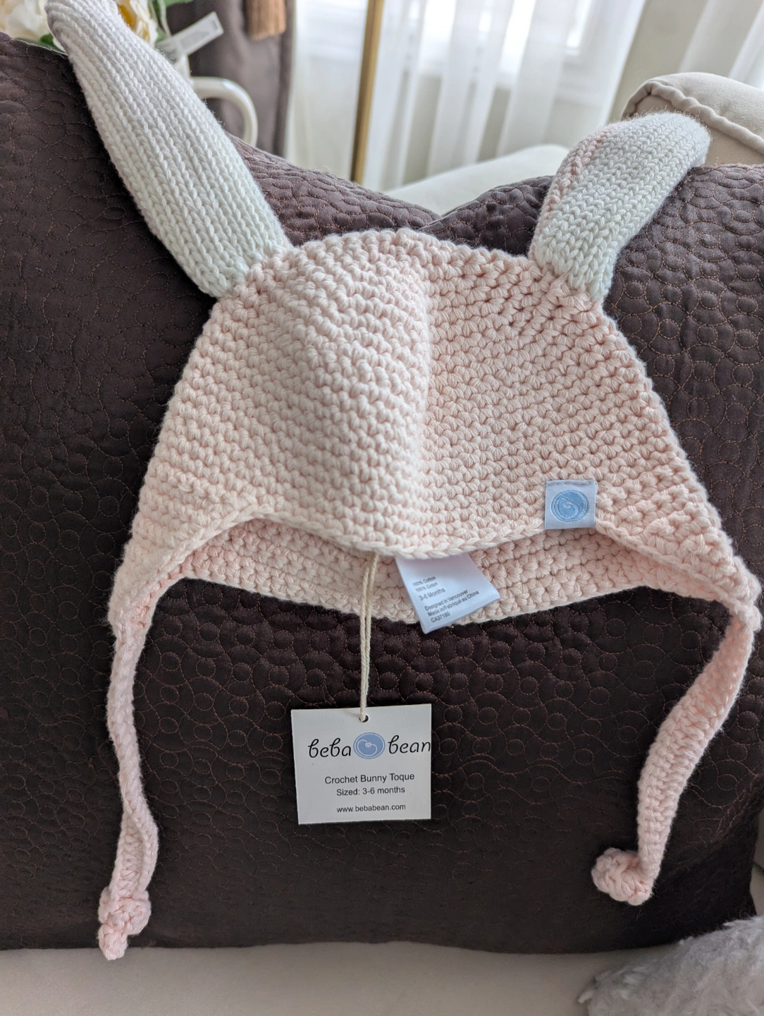 A cozy, pink, crocheted bunny toque. Features two long, pointed ears. Includes ties to secure under the chin. Perfect for keeping your little one warm during cooler days.
