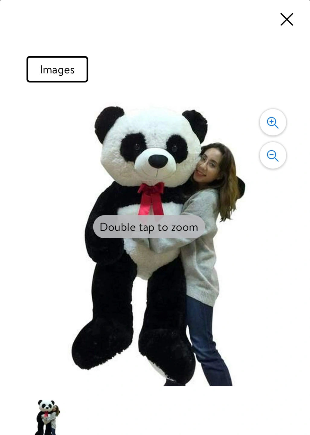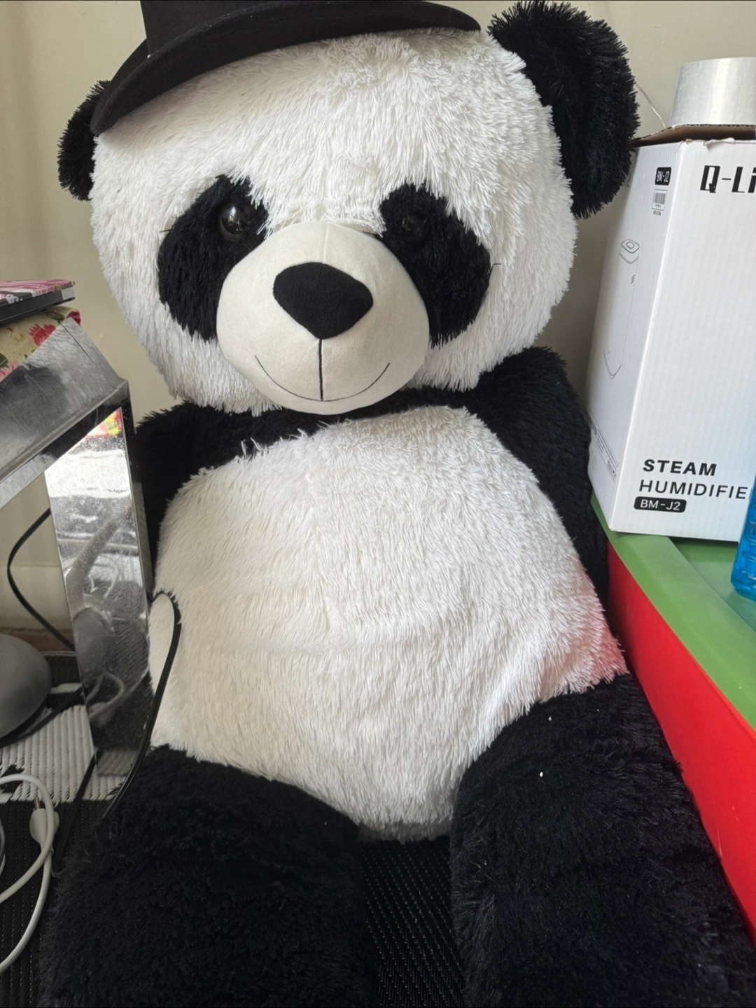 Plush panda bear. Features black and white fur. The bear is quite large. A comforting companion for quiet nights.