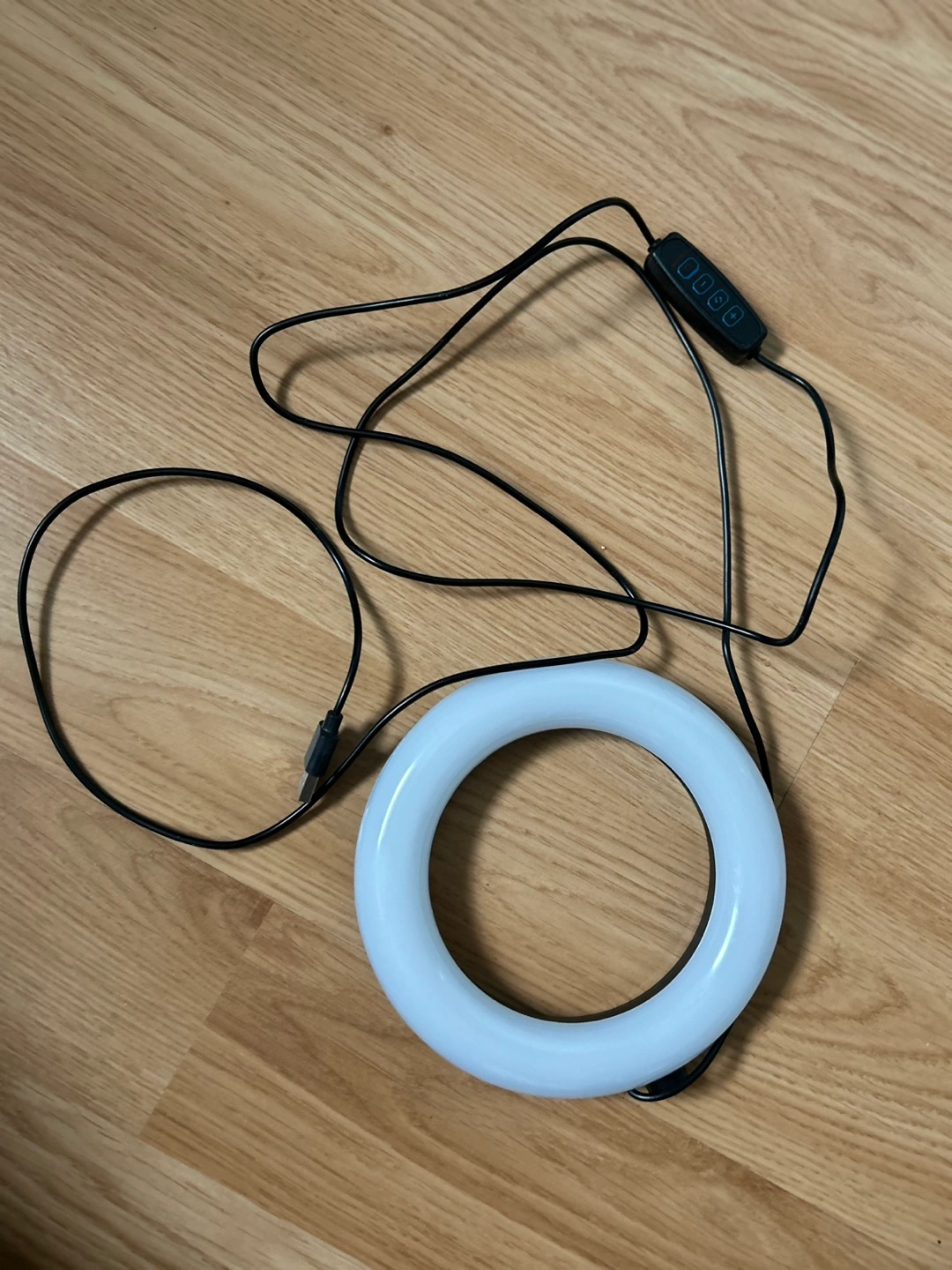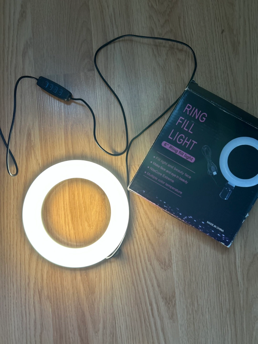 6” ring light with 3 different modes and adjustable brightness. Does not come with a stand but can be screwed onto one. Requires a USB charging block for use.