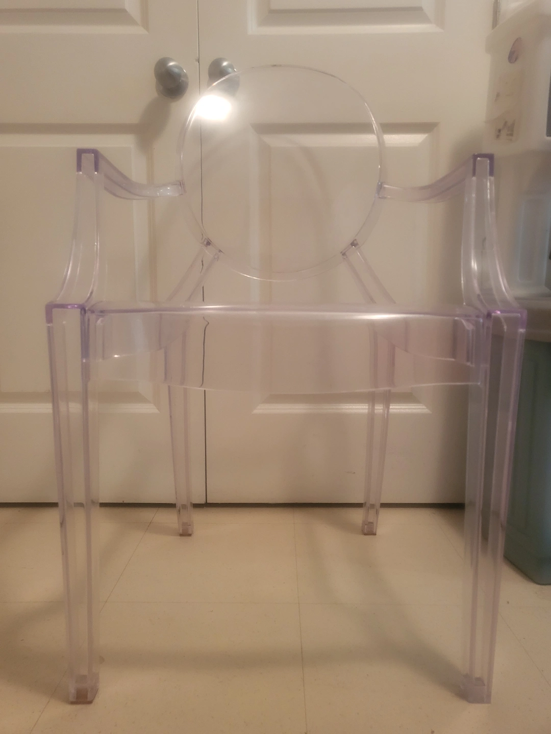 Clear plastic chair with a circular back. The chair has armrests. Could be a great seating option to elevate any dining experience. 2 chairs for $60.00