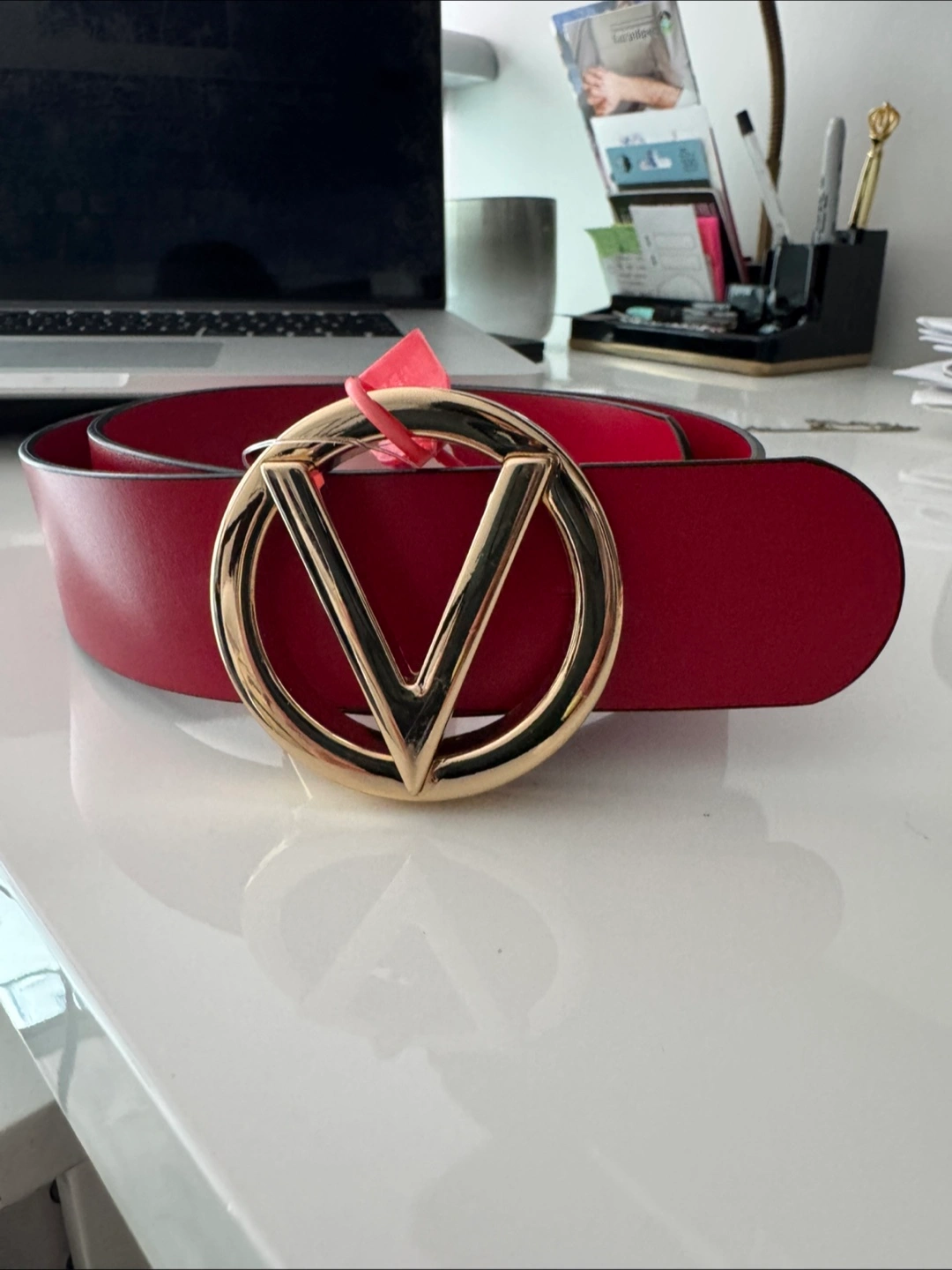 Red belt. Large gold buckle. Features the Valentino logo. A beautiful belt to add a pop of colour to any outfit.